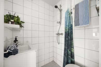 Entré – Velkommen inn! Lys og praktisk entré med god plass til å henge fra seg yttertøy og sette fra seg sko. Her er det gode oppbevaringsmuligheter i plassbygd skyvedørsgarderobe med speilfronter. Stue Lyst og innbydende oppholdsrom med sosial, åpen kjøkkenløsning. De store vindusflatene slipper inn rikelig med naturlig lys og gir rommet en luftig følelse. Svært god arealutnyttelse med plass til sofa, spisebord og annet ønsket møblement. Oppbygd seng gir ekstra plass til møbler. Fra stuen er det utgang til en hyggelig balkong på ca 3 m², med plass til en liten sittegruppe, grill og beplantning. Her kan du virkelig nyte late sommerdager! Kjøkken Praktisk kjøkken med gode oppbevaringsmuligheter. Kjøkkeninnredningen har hvite fronter og heltre benkeplate med nedfelt kum. Kjøkkenet er utstyrt med frittstående kjøl/fryseskap, oppvaskmaskin og komfyr. Kullfiltervifte over stekesone. Bad Flislagt bad med behagelig gulvvarme og mekanisk avtrekk. Innredningen består av servantskap, klosett med innebygd sisterne, og åpen dusj. Borettslaget gjennomførte en felles rehabilitering av soilrør og bad i ca. 2002.