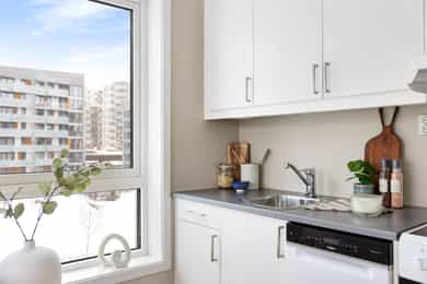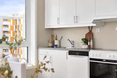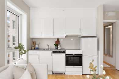 Integrerte hvitevarer medfølger. Komfyr, kjøleskap og oppvaskmaskin er også inkludert.