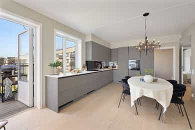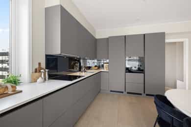 HOVEDDEL Entré: Innenfor inngangsdøren møtes man av en felles gang med inngang til både utleiedelen og hoveddelen. Stue: Hyggelig og lys stue med store vindusflater. Rommet har en klassisk planløsning med flere innredningsmuligheter. Det er god plass til sofagruppe, spisebord og annet ønsket møblement. Stuens plassering på byggets hjørne gir en vegg med ekstra vindusareal, noe som skaper en lys og luftig romfølelse. Stuen er malt i en lun og behagelig farge, og gulvet er dekket med parkett. Kjøkken: Kjøkkenet ligger i en åpen og sosial løsning mot stuen og spisestuen. Lekkert kjøkken fra HTH med moderne, slette fronter og laminert benkeplate. Kjøkkenet har en praktisk og funksjonell utforming, med godt med skap- og benkeplass. Det er utstyrt med integrerte hvitevarer som induksjonstopp, stekeovn, oppvaskmaskin, kjøleskap og fryseskap. Avtrekk via balansert ventilasjonsanlegg. Bad: Stilrent, flislagt bad fra byggeåret med vannbåren gulvvarme og downlights i taket. Innredningen består av nedfelt servant med underskap, speilskap, vegghengt toalett, dusjhjørne med svingbare dører og opplegg for vaskemaskin. Rommet har balansert ventilasjon. Soverom: Stort hovedsoverom med god plass til dobbeltseng og tilhørende møbler. De store vindusflatene slipper inn rikelig med naturlig lys. Det er godt med skapplass i en plassbygd garderobeløsning rundt og over sengen. En lekker spilevegg gir rommet det lille ekstra. Rommet er malt i en lun farge – perfekt for en god natts søvn! Soverom 2 og 3: To lyse og lettmøblerte soverom som gir stor fleksibilitet. Enten du trenger barnerom, gjesterom eller hjemmekontor, har du gode muligheter til å tilpasse rommene etter egne behov og ønsker. HYBEL Flott utleiedel med inngang fra felles entré. Utleiedelen har en god planløsning med åpen stue-/kjøkkenløsning og flislagt bad. Stue/kjøkken: Lys og hyggelig stue med gode innredningsmuligheter. Store vindusflater slipper inn rikelig med naturlig lys. En flott fransk balkong skaper en forlengelse av rommet og gir gode luftemuligheter. Stuen er innredet med sofa, seng, skrivepult og øvrige møbler. Pent kjøkken med praktisk utforming, integrert platetopp og stekeovn, samt plass til frittstående kjøleskap. Plassen er godt utnyttet med skap- og benkeplass. Avtrekk via balansert ventilasjonsanlegg. Bad: Pent flislagt bad med opplegg for vaskemaskin. Badet har flislagte overflater, vannbåren gulvvarme og downlights i taket. Innredningen består av servant med underskap, speilskap, vegghengt toalett og dusjhjørne med svingbare dører. Rommet har balansert ventilasjon. INNVENDIG OVERFLATER - Himlinger med malt betong og malte plater. - Vegger med malte plater og malt betong. - Gulv med tre- og en-stavs parkett. - Takhøyden i stuen ble målt til: 2,60 m.
