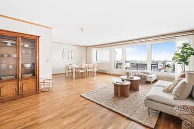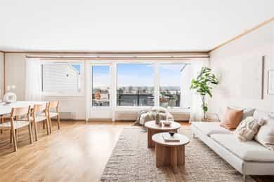Velkommen til en lys og solrik 3-roms toppleilighet i populære Nordseterskogen Borettslag. Leiligheten ligger fritt og usjenert til i 4. etasje. God planløsning med potensial. Utgang til en solrik terrasse på hele 20 kvm med fantastisk fjordutsikt. - Lys og god planløsning - Fantastisk fjordutsikt - Kjøkken i separat rom - To bad - Solrik terrasse på 20 kvm - Idyllisk beliggenhet rett ved Nordseterskogen - Garasjeplass med mulighet for kjøp av elbillader - To boder - Bilfri skolevei til Kastellet skole - Ingen dok.avgift Boligen har en meget attraktiv beliggenhet rett ved Nordseterskogen som er et grønt og frodig friområde. Her bor man stille og rolig til kun noen få meter fra skogen. Dagligvarebutikk og bussholdeplass i umiddelbar nærhet, samt kort vei til Lambertseter Senter.