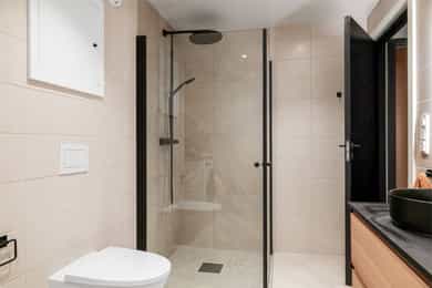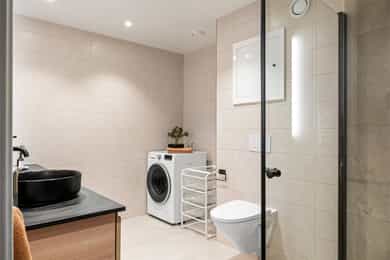 Badet ble oppgradert i 2023 med fliser, varmekabler og nytt sanitærutstyr.
