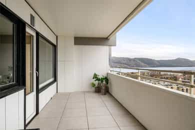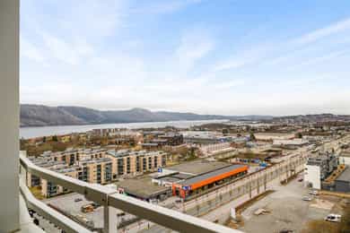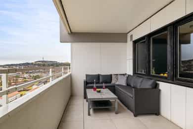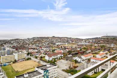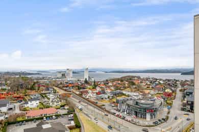 Oppusset toppleilighet i 16. etasje med stor balkong, panoramautsikt og utmerkede solforhold. Nyere bad og fast parkering