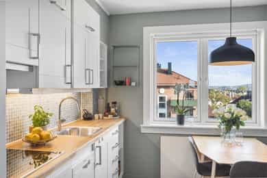 6 etasje: Borettslaget har heis og trapp opp til leiligheten. Entré: Åpen entré med plass til ytterklær og sko i garderobeskap. Callinganlegg med døråpner. Bad / wc: Delikat, flislagt baderom fra 2014 med gulvvarme. Innredet med veggmontert WC, dusjplass med glassvegger og servant med ettgreps blandebatteri. Badet ble pusset opp i regi av borettslaget i 2014. Kjøkken: Moderne kjøkkeninnredning med hvite profilerte fronter, benkeplate i tre og fliser mellom overskap. Kjøkkenet har nedfelt oppvaskkum med ettgreps armatur, integrert kjøl/frys, opplegg for oppvaskmaskin samt kullfiltervifte over integrert koketopp og stekeovn. Med rikelig skap- og benkeplass er dette et funksjonelt og innbydende kjøkken som legger godt til rette for matlaging. Stue: Arealeffektiv stue som gjør det enkelt å møblere med sofa og tv-møblement. Stort vindu som slipper inn godt med naturlig lys og som har en flott utsikt. Praktisk sovealkove: Leiligheten har en arealeffektiv planløsning med en praktisk sovealkove i enden av boligen. Det er et vindu som slipper inn rikelig med lys og skaper en behagelig og romslig atmosfære. Det er plass til dobbeltseng i sovealkoven hvis man ønsker det. Bod: Leiligheten disponerer en loftsbod med gulvareal på ca. 1,2 m². Boden har skråtak. Overflater: Gulv: Gulvflater belagt med parkett. Vegger: Vegger med malt betong og malte overflater. Himling: Malte overflater i himlinger. Vinduer: 2-lags press glass, prod. 2016. VVS-installasjoner, generelt (ventilasjon, varme og sanitær): Integrert ventilator over platetopp på kjøkken. Baderom med mekanisk avtrekk i himling. Fjernvarme tilknyttet radiator og gulvvarme på badet, vannrør av rør-i-rør og avløpsrør av plast. Elkraft: Sikringsskap med automatsikringer i trappeoppgang. Diverse: - Internett (Fibernett). - Porttelefon. Standard Boligen fremstår som pen og velholdt med praktisk og arealeffektiv planløsning. Se vedlagt tilstandsrapport for tilstandsgrader på leiligheten.