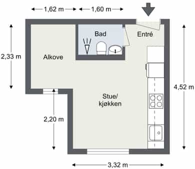 BRA-i: 19 kvm. Entré, bad, alkove og stue/kjøkken.