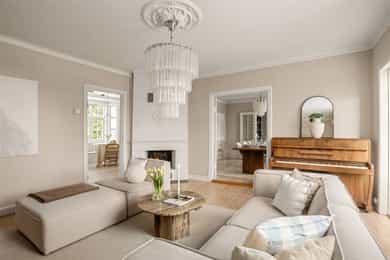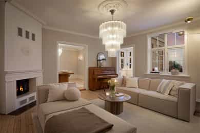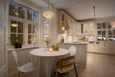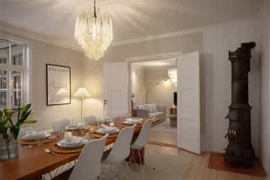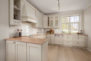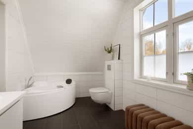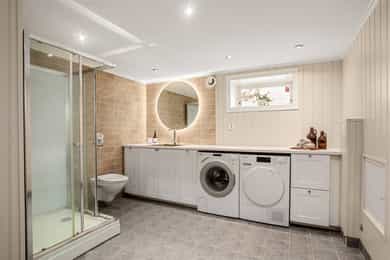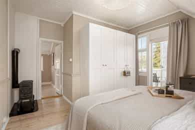 1. Etasje: Entré: Velkommen hjem. Pent opparbeidet inngangsparti med flislagt trapp og klassisk inngangsdør. Lys og flott gang med garderobeskap som gir plass for oppbevaring av yttertøy og sko. Stue/Spisestue/Bibliotek: Boligen har nydelige oppholdsrom med stue, spisestue og bibliotek. Her er det gode møbleringsmuligheter i flere ulike soner, samt klassisk preg med tofløyede dører mellom stuene. Stuen er innredet med sofagruppe og tilhørende tv-møblement. Det er flott innmurt peis i stuen som bidrar til en lun atmosfære. Fra denne stuen er det videre adkomst til vinterhage og uteområdene. Videre er det stor spisestue med god plass til langbord og tilhørende møblement. Stuen har flotte detaljer som bredt, profilert listverk, stukkatur og flott vedovn. Fra spisestuen er det praktisk med åpning til kjøkken. Videre adkomst til bibliotek/kontor med plassbygde hyller og skrivebord. Det er også montert varmepumpe her. Kjøkken: Pent og innholdsrikt kjøkken fra 2005 med innredning fra Sivesind. Kjøkkenet er utstyrt med integrert utstyr som stekeovn, dampovn, platetopp, oppvaskmaskin og frittstående kjøl/fryseskap. Kjøkkenet har profilerte fronter, flislagt over kjøkkenbenk og benkeplate i heltre. Kjøkkenet er oppgradert i 2023 med fliser mellom over- og underskap, slipt benkeplate og satt inn ny porselensvask og kran. I tilknytning til kjøkkenet er det plass for hyggelig frokostbord. 2. Etasje: Gang: Romslig gang med plass for skrivebord eller annet ønskelig møblement. Det er integrerte garderobeskap som gir plass til diverse oppbevaring. Fra gangen er det adkomst til flott balkong med nydelig utsikt og gode solforhold. Soverom: I denne etasjen finner du 3 soverom. Hovedsoverommet er lyst og pent med god plass til dobbeltseng med tilhørende nattbord. Det er plass for garderobeskap med god plass til oppbevaring. Fra soverommet er det adkomst til balkong på ca. 5 kvm med hyggelig utsikt. Soverom 2 og 3 passer perfekt som gjesterom, barnerom eller kontor. Bad: Romslig bad fra 2016 med flislagte overflater og varmekabler i gulv. Badet er utstyrt med heldekkende servant med underskap, speilskap med lys, dusjkabinett, badekar og toalett. Loftetasje: Loftetasjen er innredet med loftstue og soverom. Det opplyses om at det ikke foreligger noen dokumentasjon for innredning av loft til oppholdsrom, og rommene er derfor å anse som boder. Kjeller: Gang: Romslig gang med flislagt gulv og varmekabler. Det er satt inn praktisk garderobeløsning med skyvedører, som gir godt med oppbevaringsmuligheter. Det er egen utgang fra kjelleretasjen. Soverom: Stort soverom med flislagt gulv og behagelige varmekabler. Soverommet gir god plass for dobbeltseng med tilhørende nattbord. Det er innfelte downlights i tak for tilpasset belysning. Bad/Vaskerom: Pent og praktisk bad og vaskerom med flislagt gulv og varmekabler i gulv. Badet er utstyrt med innredning med nedfelt servant, skap og nisje for vaskemaskin og tørketrommel, samt toalett og dusjkabinett.