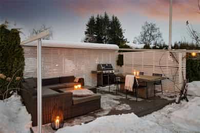 Usjenert og skjermet hage med markterrasse og elektrisk markise, drivhus og jacuzzi. Her kan du nyte gode solforhold i lune og skjermede omgivelser. Hagen er omkranset med hekk og diverse trær og prydbusker. Uteområdene gir boltreplass for store og små, er inngjerdet som gir trygge omgivelser for både barn og husdyr. I tillegg er det montert utebelysning på både fasade og garasje.