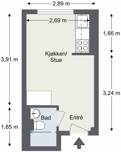 BRA-i: 15 kvm. Entré, bad og stue/kjøkken.