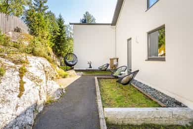 Underetasje: Underetasje med egen inngang, og garasje med tilgang til romslig bod. Videre er det flere gode oppbevaringsmuligheter i innvendig bod og under trappen til 1. etasje. Bad: Pent, moderne bad fra 2019 med gulvvarme og mekanisk avtrekk. Badet er utstyrt med toalett, dusjplass med inn-utadslående dusjvegger, speilskap og servant med ettgreps blandebatteri i innredning. Fliser på vegger og gulv. Vaskerom: Boligen har eget vaskerom med utslagsvask, godt med skap- og benkeplass og opplegg for vaskemaskin og tørketrommel under praktisk benk. Det er sluk i gulv, mekanisk avtrekk, samt behagelig gulvvarme. Soverom/kontor: Lunt soverom/kontor med gulvvarme. God plass til seng eller kontorpult - alt etter eget ønske. Stort vindu med dyp karm som gir en ekstra god romfølelse. Det er parkett på gulv, og malte veggflater. Allrom: Stort, luftig rom som er den perfekte TV-stuen. Det er god plass til sofagruppe og tilhørende møblement. Rommet har gulvvarme. Det er parkett på gulv, og malte veggflater. 1. etasje: Entré: En innbydende entré ønsker velkommen inn! Her er det god plass til klær og sko i stor skyvedørsgarderobe. Det er gulvvarme i hele etasjen. Ytterdør med vindu og pent opparbeidet terrasse med trapp gir et godt førsteinntrykk som videreføres når man trer inn i boligen. Bad: Lekkert, flislagt bad fra 2019 med gulvvarme og mekanisk avtrekk. Badet byr på dobbeldusj (regnfalls) med glassvegger, vegghengt toalett, dobbel servant med underskap og stort speilskap med belysning. Adkomst både fra hovedsoverom og mellomgang. Soverom: Det er 3 soverom i 1. etasje. Luftig hovedsoverom med stort vindu. Det er plass til dobbeltseng, nattbord, kontorpult, kommode etc. Fra hovedsoverommet er det direkte adgang til bad, omkledningsrom og balkong. Soverom nr. 2 har også god plass til seng, nattbord, kommode og garderobeløsning. Fra rommet er det direkte utgang til hage. Det siste soverommet er perfekt til barnerom, kontor eller gjesterom. Kjøkken: Pent og praktisk kjøkken med hvite glatte fronter og god skap- og benkeplass. Kjøkkenet byr på integrerte hvitevarer bestående av induksjonstopp, stekeovn, mikro, oppvaskmaskin, og kjøleskap og fryseskap - begge i full størrelse. Benkeplate i laminat med slitesterk kum og lys under overskap. Det er plass til spisebord på kjøkkenet og det er direkte utgang til platting. Stue: Luftig stue med plass til sittegrupper, spisebord og annet møblement. Fra stuen er det utgang til solrik, vestvendt balkong som strekker seg langs store deler av vestveggen. Balkongen byr på god boltreplass og har rekkverk i glass, fastmonterte utelamper og hyggelig utsyn mot hagen. 2. etasje: Stue: Et av boligens mange høydepunkt er en svært romslig og stilig stue i 2. etasje. Rommet har karakteristiske vinduer i 3 retninger, samt ekstra takhøyde som gir særdeles gode lysforhold og en åpen, luftig atmosfære. Her er det mange innredningsmuligheter. Lekker peisovn i stuen gir en lun atmosfære på vinter- og kveldstid. Fra stuen er det utgang til en fantastisk takterrasse med delvis takoverbygg og flott utsikt. Takterrassen er vestvendt og har et gulvareal på 39 kvm. Soverom Lunt og koselig soverom med plass til seng og tilhørende møblement.