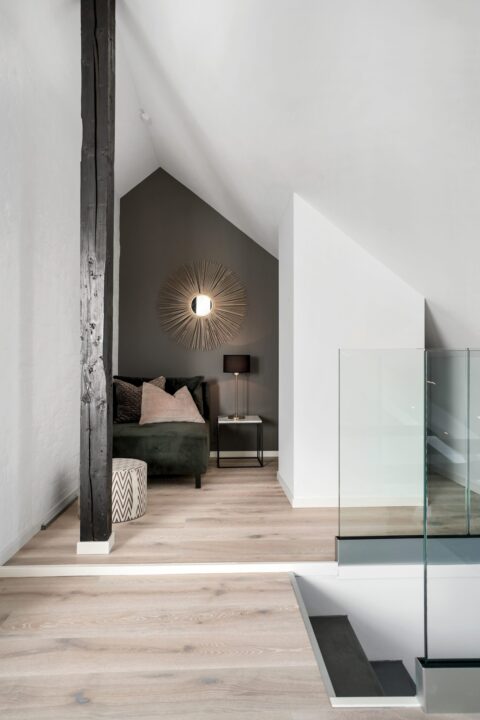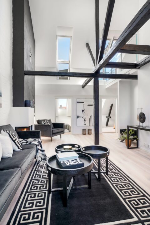 – Når rommet er stort nok og med magisk takhøyde som her, kan man fint fremheve boligens særpreg og la noen unike detaljer vises. Ved å løfte frem historikk og sjel, så får man rom som oppleves gode å oppholde seg i. Her har bjelkene blitt malt mørke, noe som gir rommet karakter og setter et tydelig preg, effektfullt og vakkert, viser Tina.