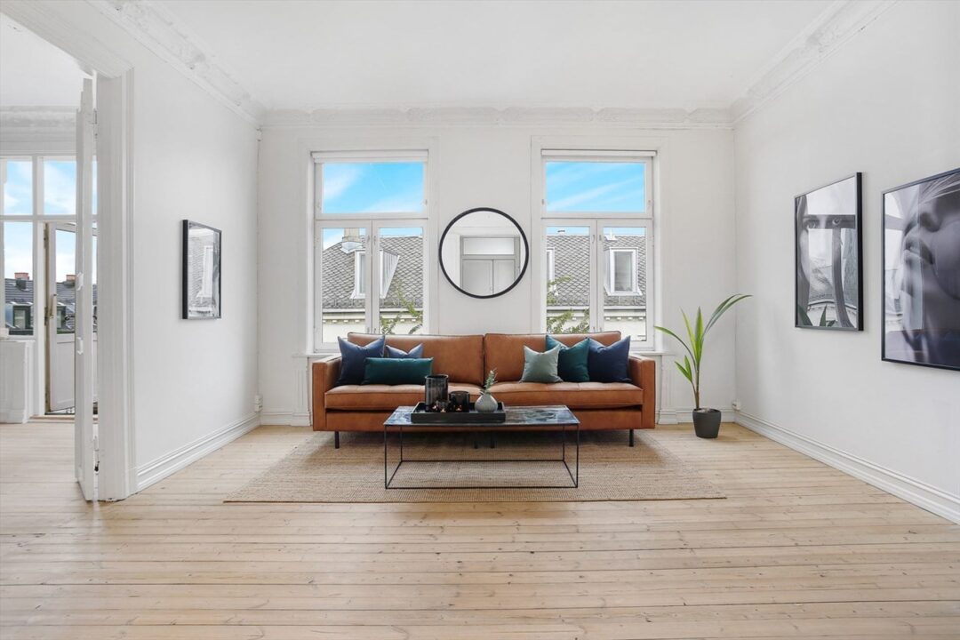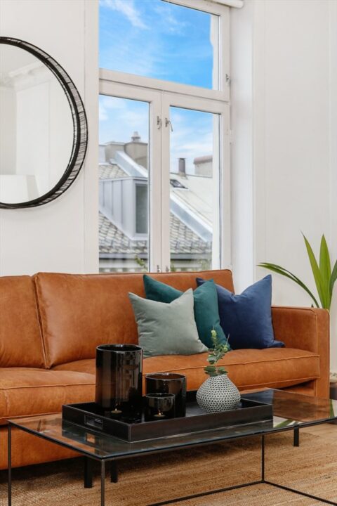 – Cognacfarget skinn har hatt en sterk tilbakekomst i år. Gå for et skinn i god kvalitet, da patinaen på kvalitetsskinn bare blir vakrere med årene. La også gjerne møbelet få spille hovedrollen i rommet som her, forteller Tina.