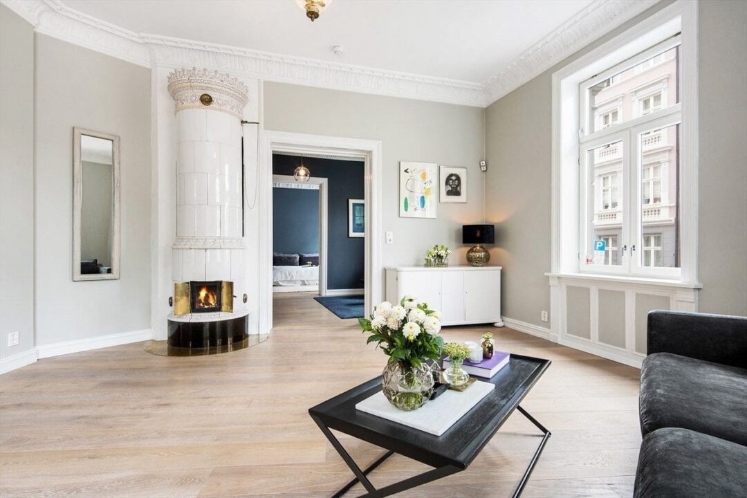 – Alle rom trenger et fokalpunkt. Det kan være et stort speil, et bilde, en farget fondvegg eller her en nydelig kakkelovn. Denne gir ikke bare fysisk varme, men er i tillegg visuelt vakker og fyller rollen som en sterk bidragsyter for stemningen i rommet. Legg også merke til hvordan sofaen er plassert diagonalt, for å understreke hvordan den fungerer som en utgjørende del av inventaret så vel som interiøret, forteller Tina.