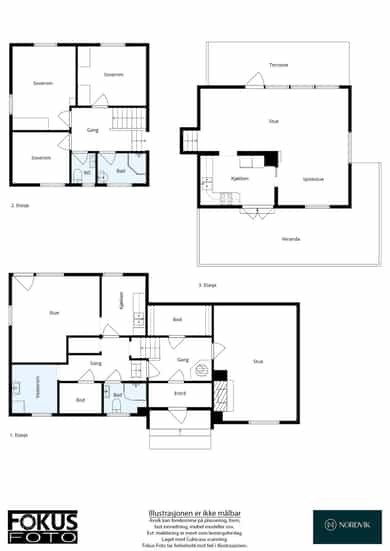 1. etasje - Plan 1 og 2: Gang, bad, bod, vaskerom, kjøkken, 2 stuer, vindfang, gang og bod 2. etasje - Plan 3 og 4: Gang, bad, WC, 3 soverom, stue og kjøkken
