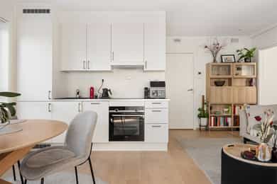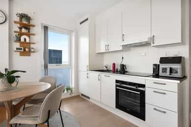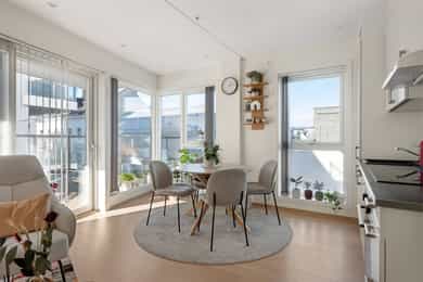 Entré Lys innbydende entré med plass til klassiske gangmøbler. Det er avhengingsplass og mulighet for knaggrekke på vegg, sko hylle, sidebord og lignende. Adkomst til bodrom/teknisk rom med noe oppbevaringsplass. Entreen har flislagt gulv. Stue Åpen stuedel med stue, spisestue og kjøkken i et åpent og lyst rom. Stuedelen har godt med vindusflater som gir rikelig med dagslys inn. Fra stuen er det atkomst til soverom fra to sider via skyvedører. Noe ulik mulighet for møblering med sofa, tv-benk, spisegruppe og vitrineskap etc. Kjøkken Pent kjøkken fra byggeåret i åpen løsning til stue og spisestue. Innredningen er lys med slette fronter, laminerte fronter og skrog. Laminert benkeplate med sort oppvaskkum i kompositt materiale. Det er integrert koketopp, stekeovn, oppvaskmaskin og kjøl/fryseskap. Det er montert komfyrvakt og waterguard. Spisegruppen er strategisk plassert i åpen løsning til kjøkkenet. Bad, wc og vaskerom Lyst og tidløst helfliset bad med downlights i himlingen. Lys baderomsinnredning med slette fronter og heltrukket servant med to underskuffer. Stort speil over servanten. Dusjhjørne med dusjdører. Vegghengt toalett og opplegg for vaskemaskin og tørketrommel. Det er varme i gulvet og meksnisk avtrekk. Soverom Leiligheten har et stort og lyst soveværelse med gode lysforhold fra det store vinduet. Det er god plass til dobbeltseng med tilhørende nattbord. Tredørs romslig skyvedørsgarderobe med rikelig oppbevaringsplass. En dør med speilglass. Det er downlights i himlingen for god belysning. Lagring Innvendig bod/teknisk rom til lagring. Romslig nettingbod i kjeller, boden i kjeller er merket med B28. Tekniske installasjoner Synlige vannrør i plast/rør-i-rør. Synlige avløpsrør i plast. Fjernvarme i flere gulv og forbruksvann varmes også opp av dette anlegget. Generelle materialvalg Innvendige overflater i himling med malte glatte flater, malte elementer og systemhimlinger. Innvendige vegger med malte glatte flater og fliser. Innvendige gulv med parkett og fliser. Innerdører er slette/lette dører og skyvedører. Ventilasjon består av balansert ventilasjon. El-anlegg med automatsikringer. I hovedsak skjult ledningsnett. ___________________________________ Det er i forbindelse med salget utarbeidet en tilstandsrapport fra bygningssakkyndig. Tilstandsrapporten er en teknisk gjennomgang av boligen med oppdagede avvik. Forhold som har fått TG2 og TG3 må gjennomgås spesielt nøye, da disse indikerer avvik fra normal slitasje og/eller høy alder, med mulig behov for utbedring. Bygningsdeler som har fått TGIU er ikke undersøkt av takstmann. Bygningsdeler som har fått TG2: - Utvendig > Andre utvendige forhold Avvik: For rapporter som gjelder leilighet i et boligselskap er undersøkelsene i hovedsak begrenset til innvendig i leiligheten. Oppfordrer alle til å sette seg inn i vedtekter, husordensregler, regnskap, budsjett og årsberetning. Det gjøres oppmerksom på at fellesgjeld og felleskostnader kan variere over tid som følge av beslutninger foretatt i boligselskapets styre og/eller generalforsamling. Det er ikke forevist eller kjent om boligselskapet har vedlikeholdsplan. Bygningsdeler som har fått TG3: - Ingen. Bygningsdeler som ikke er undersøkt (TGIU): - Utvendig > Diverse Avvik: Selger opplyser at leiligheten disponerer bod i parkeringskjeller. Rom som ligger utenfor boenheten, men som eier har påvist og/eller opplyst at tilhører boenheten, er oppmålt og inkludert i BRA-e. Det er ikke fremvist dokumentasjon på at rommet tilhører boenheten. Rom utenfor boenheten kan omdisponeres av borettslaget/sameiet og dette kan påvirke boligens BRA. - Våtrom > 4. etasje > Bad > Tilliggende konstruksjoner våtrom Avvik: Hulltaking for fuktmåling i tilstøtende konstruksjon er ikke gjennomført da våtrommet er bygd som våtromskabin. Ved fuktsøk på gulv er det ikke registrert måleverdier som indikerer fukt. Helse, Miljø og Sikkerhet • Boligen ligger minimum 3 etasjer over bakkenivå, radonmålinger er derfor ikke relevant. • Pga. lukket konstruksjon er ikke brann/lyd tilstrekkelig vurdert. Kontroll av brannskille krever fysisk inngrep i konstruksjonen eller kontroll av dokumentasjon. Konsekvens av utilstrekkelig brannskille kan være brannsmitte mellom brannceller. Ikke fremvist dokumentasjon.