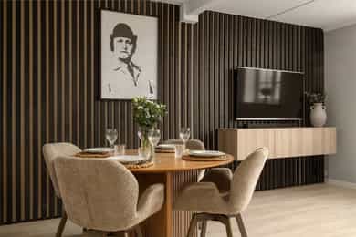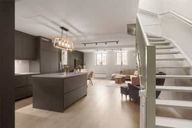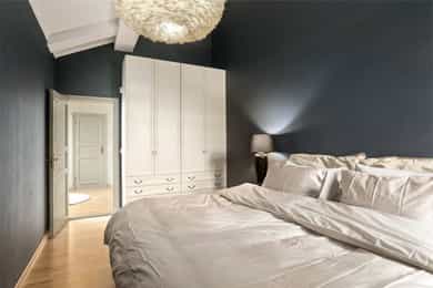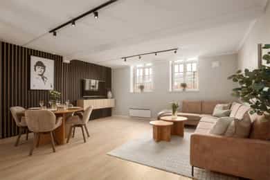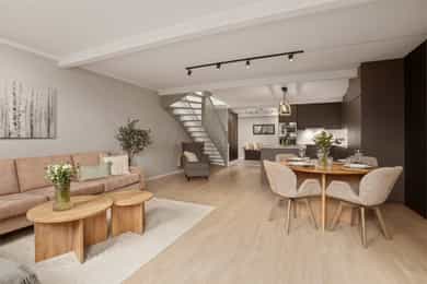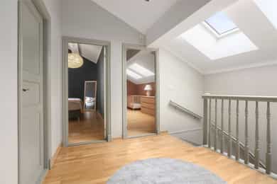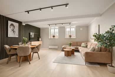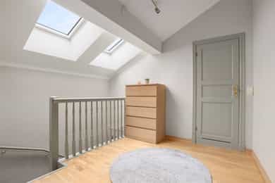 3. etg.: Entré: Velkommen hjem! Inn i leiligheten kommer man til en romslig hall med garderobeløsning som gir god plass for oppbevaring og yttertøy for å henge av seg yttertøy. Flisene på gulv i i gang er nye i 2025, samt ble stue/kjøkken pusset opp i 2024 med nye gulv og lister, samt nytt kjøkken. Stue/kjøkken: Fra hall kommer man inn til en delikat åpen stue- og kjøkkenløsning med gode møbleringsmuligheter for både sofadel og spisegruppe. Sofadelen har fine detaljer med spilevegg som gir en lun følelse. Moderne kjøkken fra 2024, velutstyrt med godt med både skap- og benkeplass, glatte overflater og integrerte hvitevarer. Stekeovn, mikro, oppvaskmaskin, integrert kjøleskap og fryser medfølger salget. Trappeadkomst opp til en tilbaketrukket boetasje. Toalettrom: Praktisk toalettrom oppusset med nye fliser på gulv i 2025. 4. etg.: Hall: Romslig hall med fine takvinduer og videre adkomst til 2 soverom, bad og garderobe/bod sammen. Soverom: To fine soverom med god størrelse gir en god planløsning for små og store. Rommene gir god plass for dobbeltseng med tilhørende nattbord og klesoppbevaring. Rommene har fine takvinkler og vindu, hvor hovedsoverommet har meget god takhøyde. Bad: Leiligheten har et meget romslig og delikat baderom. Badet er oppusset med nye flis over eksisterende flis i 2022, og inneholder både dusjhjørne, toalett og vegghengt servantinnredning. Badet har varmekabler i gulv og downlights i tak. Opplegg for vaskemaskin. Bod: Praktisk bod, som er ypperlig for oppbevaring av smått og stort.