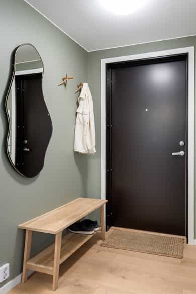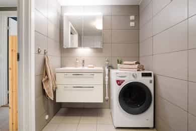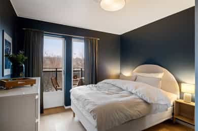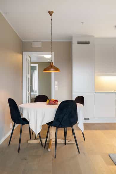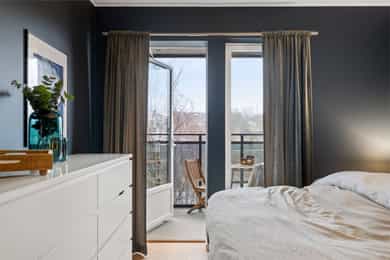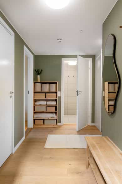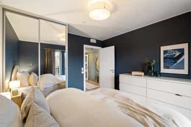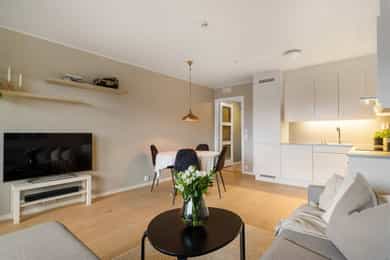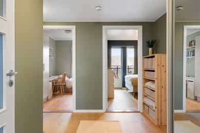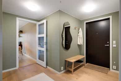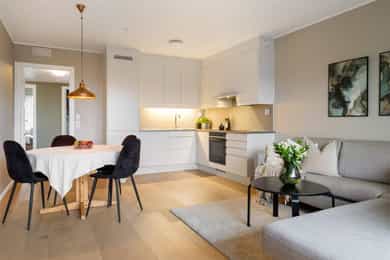 Leiligheten inneholder: Entré, bad, stue/kjøkken og to soverom. Entré: Velkommen inn! Stor og innbydende entré. Her får du et godt førsteinntrykk av leiligheten, med flott enstavs eikeparkett og pent malte vegger. Entréen har innebygd garderobeskap med speildører, i tillegg til god plass til sko og oppheng for yttertøy. Herfra er det adkomst til soverom, bad og stue/kjøkken. Stue/kjøkken: Her får du en åpen stue- og kjøkkenløsning med god plass til både sofaseksjon og spiseplass. Stuen har store vindusflater som gir rikelig med lysinnslipp. Her er det også pene overflater som tidsriktige farger og pen eikeparkett. Dette resulterer i en god romfølelse. Fra stuen er det også utgang til luftig balkong på ca. 7 kvm. Denne balkongen vender mot sør og har god plass til møblering og grill. Leilighetens kjøkken er fra Marbodal, med lyse og glatte fronter. Her er det god oppbevaringsplass i over- og underskap samt rikelig med arbeidsflate på benkeplaten, utstyrt med platetopp og nedfelt vaskekum. Kjøkkenet er utstyrt med integrerte hvitevarer som kjøl/fryseskap, oppvaskmaskin og stekeovn. Det er montert komfyrvakt og vannstoppsystem. Over kokeplassen er det montert avtrekk via anlegg for balansert ventilasjon. Soverom: Leiligheten har to romslige soverom som vender mot store grøntområder. Hovedsoverommet er malt i en behagelig blåfarge, og har god plass til både dobbeltseng, nattbord og kommode. I hjørnet er det en stor garderobe med skyvedører av speil. Fra hovedsoverommet er det også utgang til leilighetens andre balkong. Denne er på ca. 3 kvm og vender mot nord. Balkongen har god plass til kafesett, perfekt for å nyte morgenkaffen. Det andre soverommet fungerer godt som både ekstra soverom, kontor eller barnerom. I dag er rommet innredet med store garderobeskap, pult og gjesteseng. Bad: Pent flislagt bad fra byggeår, med lekre fliser på gulv og vegger. Badet er innredet med en nedfelt servant, speil med belysning, vegghengt toalett og dusj med håndholdt armatur og dusjvegger i glass. Her er det opplegg og god plass til både vaskemaskin og tørketrommel. Badet er også koblet på anlegg for balansert ventilasjon. Bod: Leiligheten disponerer en bod i kjeller på ca. 8 kvm. Innvendige overflater: Tak - Malte plater og malt betong. Vegger - Malte plater og malt betong. Gulv - Enstavs eikeparkett. Fliser med varmekabler på bad.