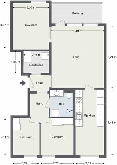 Leiligheten ligger i sjette etasje og inneholder kjøkken, stue, bad, tre soverom, entré og garderobe. I tillegg disponerer leiligheten en kjellerbod på 9 kvm.