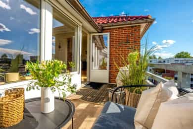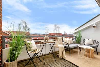 Lys og innbydende 4-roms toppleilighet på - Lekkert bad og kjøkken - Solrik balkong med fjord- og byutsikt - Heis - Garasjeplass m/el Kjøkken: Separat innbydende kjøkken med en lun fargepalett og benkeplate i tre som skaper en varm atmosfære. Fliser mellom benk og overskap gir et stilrent uttrykk, mens belysning under overskapene sørger for godt arbeidslys. Innredningen er en kombinasjon av HTH fra 2012 og IKEA 2019, med gode oppbevaringsløsninger. Kjøkkenet er utstyrt med integrerte hvitevarer, inkludert stekeovn og koketopp med mekanisk vifte over, mikro, kjøl/frys og oppvaskmaskin og kum med ettgreps blandebatteri. I tilknytning til kjøkkenet er det en hyggelig spiseplass med godt lysinnslipp. På kjøkkenet kan det settes opp en lettvegg og etablere et soverom 4. Stue: Stuen er lys og romslig med store vindusflater som slipper inn rikelig med naturlig lys og skaper en luftig og behagelig atmosfære. Her er det god plass til både sofagruppe og spiseplass, med en naturlig flyt mellom sonene. Fra stuen er det utgang til en herlig, usjenert og solrik balkong på ca. 8 kvm med fritt og fint utsyn mot både by og fjord. Balkongen byr på gode solforhold sommerstid, fra ca. kl. 09:00 til 19:00, perfekt for både morgenkaffe og sene sommerkvelder. Bad: Lyst og moderne bad, med flislagte overflater og en stilren innredning som gir et helhetlig og ryddig uttrykk. Rommet er praktisk innredet med veggmontert WC, servant i innredning med ettgreps blandebatteri, samt dusjplass med inn- og utadslående dusjvegger. Det er også opplegg for vaskemaskin og behagelig gulvvarme. Badet ble pusset opp i 2012 av Frøiland Bygg og oppgradert i 2019 med downlights, dusj, servant og møbler. Soverom 1: Soverommet er romslig og rolig, med en behagelig atmosfære og gode lysforhold. Her er det plass til dobbeltseng med tilhørende møblement, samt praktisk oppbevaring i garderobeløsning. Store vindusflater slipper inn rikelig med dagslys og bidrar til en luftig romfølelse. Soverom 2: Soverommet er et hyggelig og lunt rom med gode lysforhold og en rolig atmosfære. Rommet egner seg godt som gjesterom eller barnerom, og har praktisk oppbevaringsplass i garderobeløsning. Soverom 3: Lyst og hyggelig rom med en rolig atmosfære. Rommet egner seg godt som gjesterom eller kontor, og har plass til seng og nødvendig møblement. Vindusflate gir fint lysinnslipp og bidrar til en luftig følelse. Entré: Velkommen inn! Entréen gir et lyst og ryddig førsteinntrykk, med en praktisk garderobeløsning som sørger for god oppbevaringsplass. Her er det god plass til å henge fra seg yttertøy og sko på en oversiktlig måte. Overflater: Gulv: Parkett i alle rom. Vegger: Malte flater i alle rom Himling: Malte flater i alle rom. Takhøyden er målt til 2,4 meter i stuen.