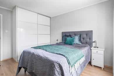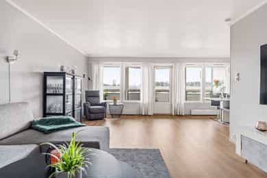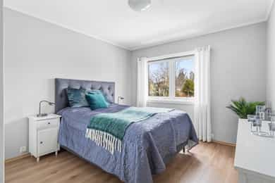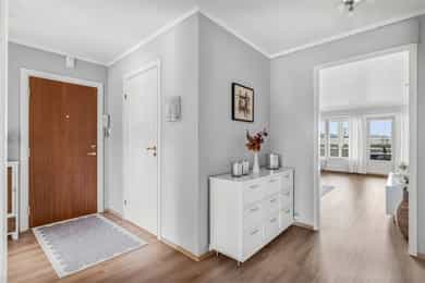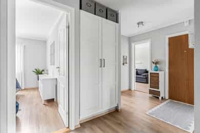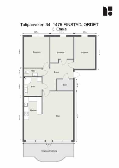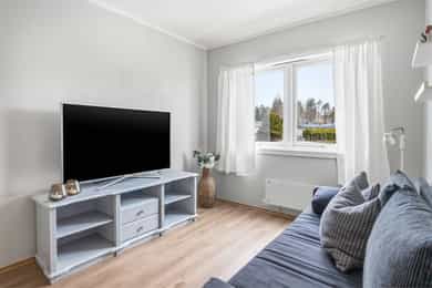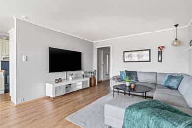 Entré Leiligheten har adkomst via felles trappegang til tredje etasje. Entréen er innbydende og sørger for et godt første inntrykk! I entréen er det god plass til å innrede med knaggrekke, skohylle eller lignende. Det medfølger garderobeskap. Stue Stuen er et sosialt oppholdsrom hvor du fint får plass til både sofagruppe og spisebord. De store vinduene og utgang til balkong gir naturlig lystilførsel til rommet og bidrar til en hyggelig atmosfære. Det er laminat på gulv og lysmalte vegger. Fra stuen har du tilgang til en sydvendt innglasset balkong. Kjøkken Kjøkkenet ligger i delvis åpen løsning mot stuen. Praktisk utformet med store dype skuffer og har rikelig med skap- og benkeplass. Den pene kjøkkeninnredningen har hvite fronter, laminat benkeplate og fliser på vegg. Det er god plass til en spisegruppe ved vinduet. Hvitevarene på kjøkkenet medfølger. Bad og toalettrom Delikat bad med fliser på gulv og vegger samt gulvvarme. Innredningen består av servantskap med skuffer og speilskap med belysning. Videre er badet utstyrt med dusjhjørne med innfellbare glassdører. Det er opplegg for vaskemaskin. Vegg-i-vegg med badet finner du et eget toalettrom. Soverom og lagring Det er tre soverom i leiligheten, alle av god størrelse. Det medfølger garderobeskap på alle soverom. Det ene soverommet blir idag benyttet som en ekstra stue. Det disponeres kjellerbod på 5 kvm for ekstra oppbevaring.