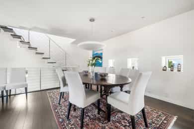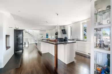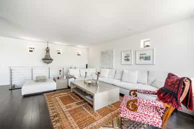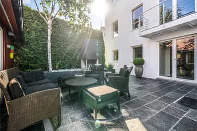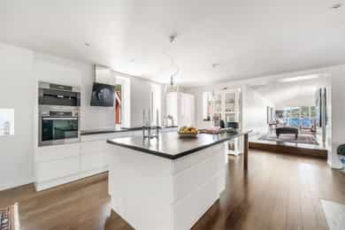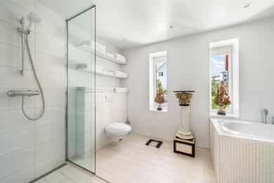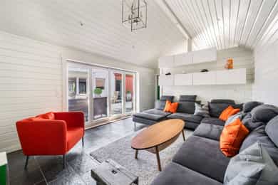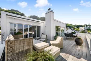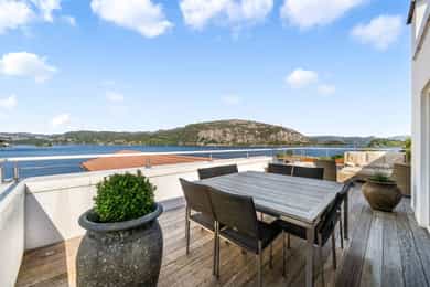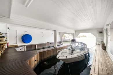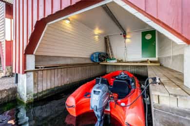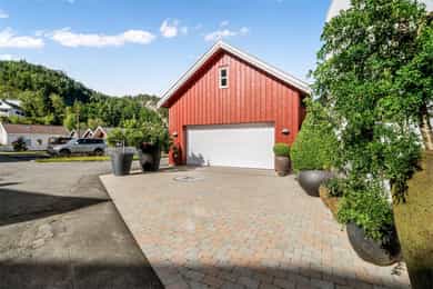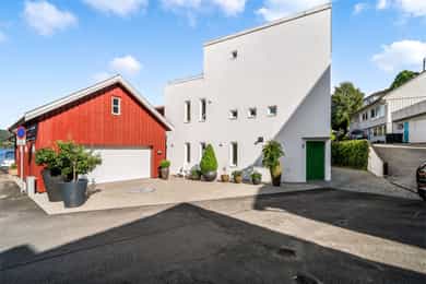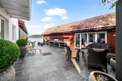 Denne eiendommen har en helt unik plassering – helt i sjøkanten og utmerker seg med høy bokvalitet, gjennomført komfort og smarte, funksjonelle løsninger. Med et bruksareal på over 400 m² byr boligen på generøse rom og moderne fasiliteter, inkludert vannbåren varme i hele bygget, også i garasjen. Hoveddelen består av entré, 3 soverom, 3 bad, garderoberom, flere oppholdsrom og et velutstyrt kjøkken. I tillegg finnes et frittstående anneks med stue, bad og hems, samt en garasje med egen stue, bad og loft – perfekt som gjestehus eller til flerbruk. Uteområdet er nøye planlagt med både privatliv og komfort. En stor, skjermet terrasse med utekjøkken og peis. Takterrasse på 40 m², med nydelig utsikt og optimale optimale solforhold. Eiendommen har brygge og 3 båtplasser – alle under tak.