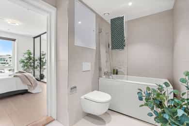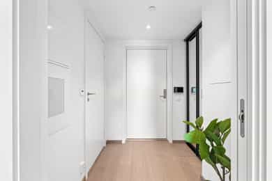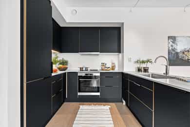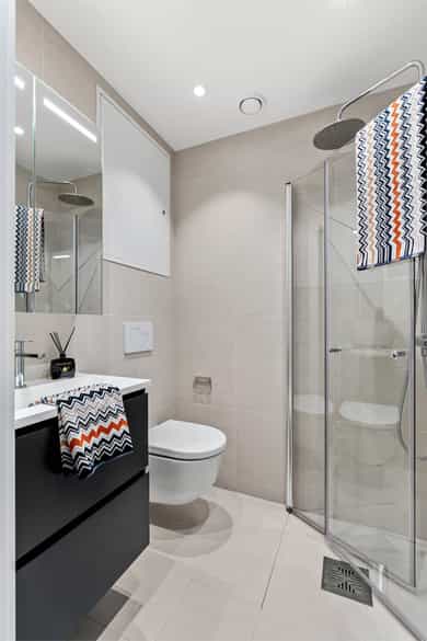 Innvendige overflater: Veggene har malte flater, med fliser på bad. Gulvene består av eikeparkett, med fliser på bad. Himlingene har malte innvendige takoverflater. Overflatene har normal bruksslitasje. Kjøkken: Kjøkkenet har HTH-innredning fra byggeår med sorte, slette fronter og kompositt benkeplate med underlimt benkebeslag og ett-greps blandebatteri. Kjøkkenet er utstyrt med integrert kjøl/frys, oppvaskmaskin, stekeovn, induksjonstopp og ventilator med mekanisk avtrekk. Ventilatoren har integrert komfyrvakt. Det er avtrekk via boligens mekaniske ventilasjonsanlegg. Våtrom - Baderom 1: Badet er fra byggeår, og det foreligger dokumentasjon på badets oppføring. Badet er flislagt og har vannbåren gulvvarme. Veggene har fliser, og taket er malt. Badet er utstyrt med heldekkende servant på underskap, speil og belysning, vegghengt klosett og dusj med dusjvegger i herdet glass. Det er også opplegg for vaskemaskin. Gulvet er flislagt, og høydeforskjellen fra topp membranterskel til topp slukrist er målt til ca. 32 mm. Badet har plastsluk og smøremembran med dokumentert utførelse. Ventilasjonen er balansert. Hulltaking er ikke utført, da badet er under 5 år og det foreligger dokumentasjon på underliggende utførelser og produktbeskrivelser. Våtrom - Baderom 2: Badet er fra byggeår, og det foreligger dokumentasjon på badets oppføring. Badet er flislagt og har vannbåren gulvvarme. Veggene har fliser, og taket er malt. Badet er innredet med heldekkende servant på underskap, speil og belysning, vegghengt klosett og dusj med dusjvegger i herdet glass. Gulvet er flislagt, og høydeforskjellen fra topp membranterskel til topp slukrist er målt til ca. 30 mm. Badet har plastsluk og smøremembran med dokumentert utførelse. Ventilasjonen er balansert. Hulltaking er ikke utført, da badet er under 5 år og det foreligger dokumentasjon på underliggende utførelser og produktbeskrivelser. Tekniske installasjoner: - Vannrør fra byggeår i materialtypene pex og kobber. - Fordelerskap plassert på badene. - Waterguard i benkeskap på kjøkken. - Avløpsrør av plast fra byggeår. - Balansert ventilasjon i leiligheten. - Felles varmtvannssystem. - Sikringsskap med automatsikringer og jordfeilbryter plassert i entré. - Samsvarserklæring er fremlagt og ligger i sikringsskap. - Brannslukkingsapparat fra 2023. - Felles røykvarslingssystem og sprinkelanlegg. Det er i forbindelse med salget utarbeidet en tilstandsrapport fra bygningssakkyndig. Tilstandsrapporten er en teknisk gjennomgang av boligen med oppdagede avvik. Forhold som har fått TG2 og TG3 må gjennomgås spesielt nøye, da disse indikerer avvik fra normal slitasje og/eller høy alder, med mulig behov for utbedring. Bygningsdeler som har fått TGIU er ikke undersøkt av takstmann. Bygningsdeler som har fått TG2: - Ingen. Bygningsdeler som har fått TG3: - Ingen. Tilstandsrapport for boligen er vedlagt salgsoppgaven. Se denne for nærmere informasjon om tilstandsgrad.