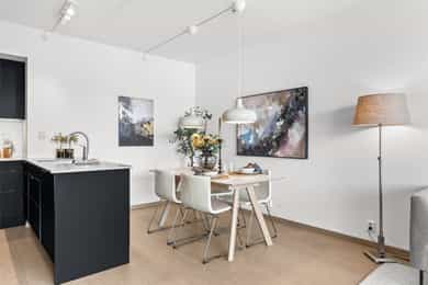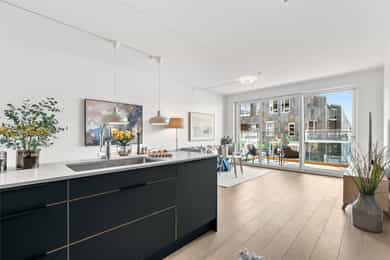 4.etasje, 83 m² BRA-I: Entré, bad, bad 2, stue, kjøkken, 3 soverom. Leiligheten disponerer ekstern bod i kjeller på ca. 6 m². Entré: Leiligheten ønskes velkommen av en innbydende entré med et moderne uttrykk. Det er etablert en romslig skyvedørsgarderobe med speilfronter for oppbevaring av yttertøy og sko. Her får man et godt førsteinntrykk av boligen, med gjennomgående malte flater og eikeparkett som bidrar til en helhetlig og stilren ramme. Stue: Stuen fremstår som et naturlig oppholdsrom med god plass til både sofagruppe og spiseplass. De malte flatene og eikeparketten gir rommet et moderne og innbydende uttrykk. Fra stuen er det direkte utgang til balkongen, noe som gir en fin forlengelse av oppholdsarealet i sommerhalvåret og bidrar til en lys og åpen romfølelse. Kjøkken: Kjøkkenet ligger i en praktisk åpen løsning med stuen. Kjøkkenet har en moderne HTH-innredning fra byggeår med sorte, slette fronter og kompositt benkeplate med underlimt benkebeslag, som gir et eksklusivt preg. Kjøkkenet er godt utstyrt med integrert kjøl/frys, oppvaskmaskin, stekeovn, induksjonstopp og ventilator med mekanisk avtrekk. Integrert komfyrvakt gir en ekstra trygghet i hverdagen. Her ligger alt til rette for både matlaging og hyggelige samlingspunkter i hjemmet. Baderom I: Baderommet er tilknyttet hovedsoverommet. Badet er flislagt og har vannbåren gulvvarme, som gir god komfort. Innredningen består av heldekkende servant på underskap, speil med belysning, vegghengt klosett og dusj med dusjvegger i herdet glass. I tillegg er det opplegg for vaskemaskin og rommet har balansert ventilasjon. Badekar. Baderom II: Boligens andre bad holder samme moderne standard og er praktisk plassert i entréen. Badet er flislagt og har vannbåren gulvvarme, samt heldekkende servant på underskap, speil med belysning, vegghengt klosett og dusj med dusjvegger i herdet glass. Hovedsoverom: Hovedsoverommet er romslig med en privat og skjermet følelse. Her er det etablert en romslig skyvedørsgarderobe med speilfronter som sikrer god oppbevaring. Hovedsoverommet har direkte tilknytning til eget bad, noe som gir en praktisk og komfortabel løsning i hverdagen. Soverom II: Soverom nummer to egner seg godt som barnerom, gjesterom eller kontor, avhengig av behov. Soverom III: Det tredje soverommet gir fleksible bruksmuligheter og kan benyttes som ekstra soverom, hjemmekontor eller hobbyrom. Her er det også direkte utgang til boligens balkong. Balkong: Fra stuen er det utgang til balkong på ca. 10 m². Selger informerer at balkongen har gode solforhold fra tidlig ettermiddag og utover kvelden i sommerhalvåret, noe som gir fine rammer for hyggelige uteopphold.