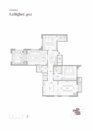 Leilighet 403 har store sosiale oppholdsrom, en gjennomgående planløsning med lysinnslipp fra alle fire himmelretninger, stor spisestue og kjøkken på rad, adskilt stue med utgang til en lun loggia, to soverom, to bad, separat vaskerom, samt et gjestetoalett.