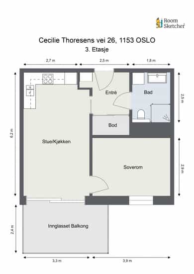 3. Etasje: Entré, bod, bad, stue/kjøkken, soverom. Innglasset balkong. Kjeller: Bod. Det gjøres særskilt oppmerksom på at bod som er medtatt som BRA-e og i totalt BRA ligger på fellesareal, men disponeres av denne leiligheten.