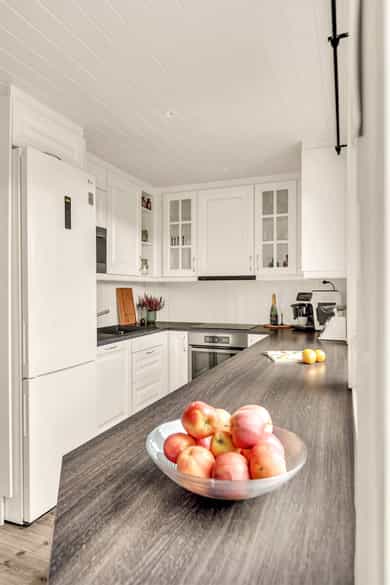 1. etasje: Entré: Velkommen! Boligen har et meget innbydende inngangsparti, med en hyggelig adkomstterrasse på 20 m². Her kan du sette sittegruppe. Vel inne i entréen er det plass til å henge fra seg yttertøy og sette fra seg sko. Stue: Stuen er av fin størrelse, med store vindusflater som slipper inn rikelig med naturlig lys fra begge ender av rommet. I rommet er det god plass til sofaseksjon, tv-møbel og spisegruppe. I rommet er det montert en peisovn, denne sikrer ekstra varme i vinterhalvåret. Fra stuen er det utgang til en herlig terrasse på 44 m². Her ute er det plass til utemøbler, samt grill. Uteplassen har fint utsyn mot frodig grøntareal. Kjøkken: Kjøkkenet byr på rikelig med benk- og skapplass! Kjøkken fra 2015 og type Aubo ihht. tidligere salgsprospekt. Innredningen har skap med profilerte fronter. Deler av overskapfronter har innfelt glass. Det er spotter innfelt i overskapet. Videre er det satt inn laminat benkeplate med nedfelt oppvaskkum med ettgreps armatur fra Blanco. Videre er det tilkoblet benkebereder og mekanisk avtrekksvifte over stekesonen. Det er integrert stekeovn, platetopp, oppvaskmaskin og mikroovn, i tillegg er det plass til frittstående kjøle-/fryseskap. Ved kjøkkenet er det inngang til en bod, som selger benytter som vaskerom. Her er det satt inn vaskemaskin. Toalettrom: Fra entréen er det inngang til et toalettrom. Rommet er utstyrt med gulvstående toalett samt servant med underskap. 2. etasje: Gang: Fra trappen kommer man opp i en lys gang. Herfra er det inngang til et bad, samt tre soverom. I tillegg er det inngang til en praktisk bod med lagringsplass. Bad: Etasjen har et praktisk flislagt baderom med elektrisk gulvvarme. Rommet er utstyrt med servantskap med en bredde på 100cm og glatte skuffefronter samt en overlimt servant med ettgreps armatur fra Adora. Videre er det satt inn dusjkabinett, mekanisk avtrekk og veggmontert wc. Badet er fra 2015 (ihht. tidligere salgsprospekt). Tre soverom: Boligen har tre gode soverom. Hovedsoverommet har plass til dobbeltseng med tilhørende nattbord. Videre er det plass til klesoppbevaring i romslig skyvedørsgarderobe med speilfronter. Soverom nr. 2 og 3 fungerer ypperlig som barnerom, gjesterom eller kontor - her er mulighetene mange. Rommene har plass til seng, nattbord, garderobeløsning og evt. skrivebord. Innvendige overflater: Gulv: Laminat, fliser Vegger: Panelplater, fliser Himling: Malte flater For full oversikt over tilstandsgrader, se punktet Byggemåte eller se vedlagt tilstandsrapport.
