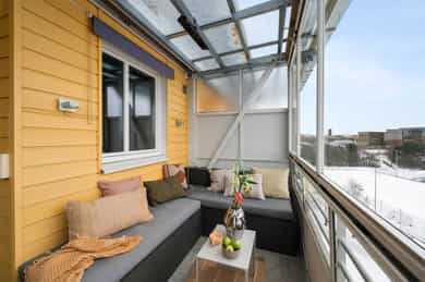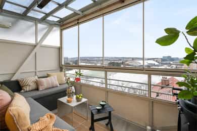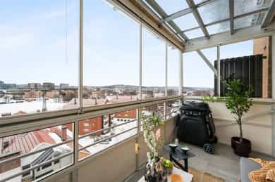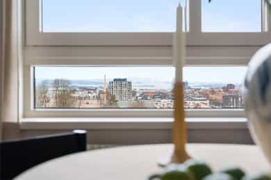 Særdeles lys og lekker 3-roms topp- og hjørneleil. med innglasset balkong og flott utsikt! V. vann og fyring inkl. Heis.