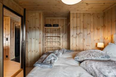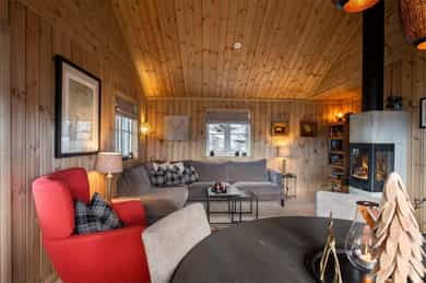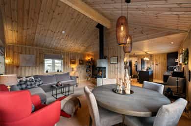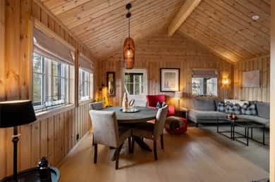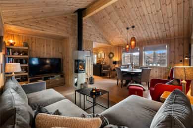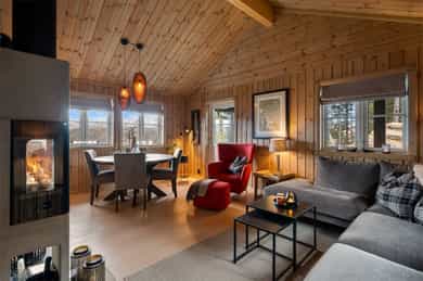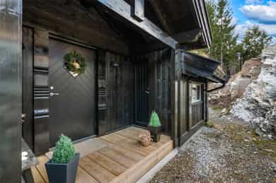 Lekker hytte (ny i 2023) i ettertraktet felt! 30m² solrikt terrasseareal. 4 sov & 2 stuer. Parkering. 6 min til skibakke