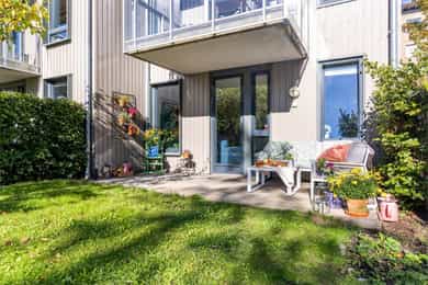 Leilighet beliggende i byggets 1. etasje. Det er adkomst via felles trappeoppgang. Oppgangen har porttelefon. Leiligheten inneholder entré, bod, bad, 3 soverom og stue/kjøkken. ENTRÉ: Velkommen inn! Leiligheten har en innbydende entré som skaper et umiddelbart godt førsteinntrykk. LYS OG LUFTIG STUE M/UTGANG TIL TERRASSE: Stuen er lys og luftig med store vindusflater som sørger for rikelig med innslipp av naturlig lys. Planløsningen åpner opp for flere møbleringsmuligheter med god plass til sofagruppe, TV-møbler og spisebord med tilhørende stoler. Gulvet er belagt med flott parkett, og overflatene er malt i delikate og moderne fargetoner. Et perfekt utgangspunkt for å innrede med egne møbler og gjenstander for å skape ditt drømmehjem. Fra stuen er det direkte utgang til en romslig og særdeles innbydende terrasse på 14 m², med gode solforhold som gir et attraktivt uterom store deler av dagen. I vår- og sommerhalvåret fungerer terrassen som en naturlig forlengelse av stuen, og gir gode muligheter for både avslapning og sosiale sammenkomster med familie og venner. Her er det god plass til utemøbler, beplantning og grill, slik at du enkelt kan skape en hyggelig og skjermet uteoase. Terrassen har direkte adkomst til sameiets grønne felles hage, noe som gir en luftig og åpen følelse, samtidig som det er svært praktisk og barnevennlig. ÅPEN KJØKKENLØSNING: Moderne kjøkken med god skap- og benkeplass. Kjøkkenet har en stilren, glatt laminert innredning med fliser mellom over- og underskap, samt laminert benkeplate med nedfelt kum og ettgreps blandebatteri. Det er belysning under overskap og mekanisk ventilator over kokesonen. Kjøkkenet er videre utstyrt med integrerte hvitevarer, herunder koketopp, stekeovn, kjøl/frys og oppvaskmaskin. HOVEDSOVEROM: Soverommet er romslig, med plass til dobbeltseng, nattbord og tilhørende møbler. De moderne fargevalgene på veggene, sammen med store vindusflater, skaper en lys og behagelig atmosfære. Rommet har også rikelig med oppbevaringsplass i en romslig skyvedørsgarderobe. SOVEROM 2 og 3: Soverommene er romslige og har god plass til seng og øvrig møblement. De fremstår som fleksible rom som enkelt kan tilpasses som barnerom, gjesterom eller hjemmekontor etter behov. I tillegg har rommene gode oppbevaringsløsninger med garderobeskap. BADEROM: Pent og romslig flislagt baderom med gulvvarme og downlights i himlingen. Badet er utstyrt med veggmontert WC, dusjplass med inn- og utadslående dusjvegger, samt servant med ettgreps blandebatteri i praktisk innredning. Det er i tillegg opplegg for vaskemaskin. INNVENDIG BOD: Leiligheten har en praktisk innvendig bod med god plass til klær, sko og annet utstyr. Denne boden gjør det enkelt å holde boligen ryddig og organisert, samtidig som du har lett tilgang til alt du trenger. OPPBEVARING: Leiligheten disponerer en bod i garasjen på 2,25 m², samt en bod i kjeller på 5,7 m². Det gjøres særskilt oppmerksom på at bod som er medtatt som BRA-e og i totalt BRA ligger på fellesareal, men disponeres av denne leiligheten. ØVRIG INFORMASJON: Entrédør: Brann- og lydklassifisert entrédør. Vinduer: Trerammer med 2-lags energiglass. Innerdører: Glatte, laminerte innerdører og dør med glassfelt mellom entré og stue. Ventilasjon: Boligen har balansert ventilasjon med aggregat bak skyvedører i boden. Elektrisk anlegg: Sikringsskap med automatsikringer er plassert i entré. Oppvarming: Leiligheten blir oppvarmet med radiatoranlegg.