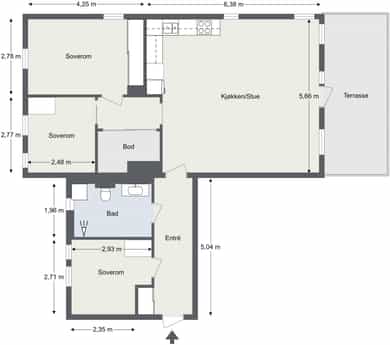 BRA-i: 85 kvm. Entré, bod, bad, 3 soverom og stue/kjøkken.