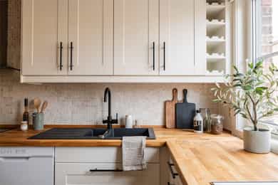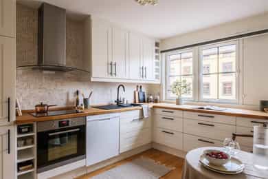 Kjøkken 4. etasje: Kjøkkeninnredning fra 2010 ifølge tidligere salgsoppgave, med profilerte fronter og heltre benkeplate. Kjøkkenet er utstyrt med skyllekum i plast og kullfilterventilator. Hvitevarer som stekeovn, platetopp og kjøleskap med fryser er integrert i innredningen. Vedr. hvitevarer se pkt. "løsøre og tilbehør" i salgsoppgaven. Bad 4. etasje: Flislagt baderom med varmekabler i gulv. Rommet ble pusset opp i 2010 ifølge tidligere salgsoppgave. Badet har slette overflater i himling. Det er utstyrt med skap med glatte fronter, klosett, dusj med dører i herdet glass og servant. Servanten har krakelering i overflaten. Det er opplegg for oppvaskmaskin. Badet har mekanisk avtrekk og tilluft via luftespalte under dør. Innvendige overflater: Gulv: Fliser og parkett. Vegger: Sparklet/pussede og malte overflater. Himling: Sparklet/pussede og malte overflater. Himlingshøyden er målt til ca. 2,40 meter i oppholdsrom, ca. 2,20 meter på bad og ca. 2,27 meter i gang. Tekniske installasjoner: - Vannledninger: Innvendige vannrør er i kobber av eldre dato. Hovedstoppekran er lokalisert under kjøkkenvasken. - Avløpsrør: Synlige avløpsrør er i plast. - Ventilasjon: Ventilasjonen består av mekanisk avtrekk på bad og kullfilterventilator på kjøkken. Tilluft via ventiler i vinduer og yttervegger, samt luftespalte under dør til bad. - Varmtvannstank: Det er montert en benkebereder av ukjent alder i kjøkkeninnredningen. - Elektrisk anlegg: Anlegget har sikringer av typen jordfeilautomater. Alder på anlegget er ukjent, og det foreligger ikke samsvarserklæring på arbeid utført etter 1999. - Branntekniske forhold: Boligen har brannslukningsutstyr og røykvarsler.