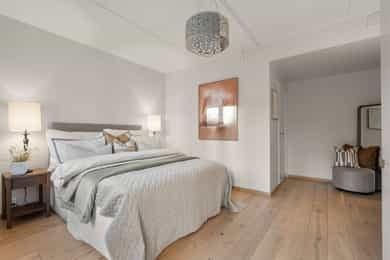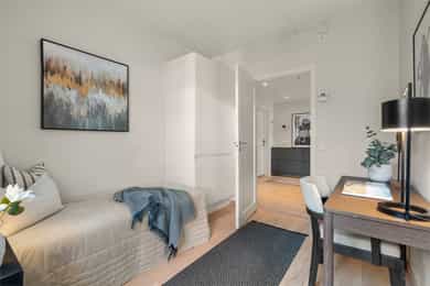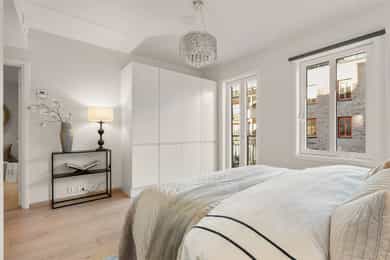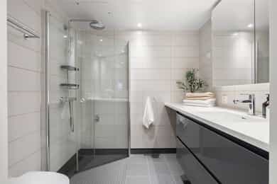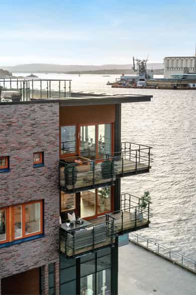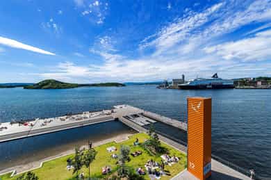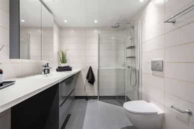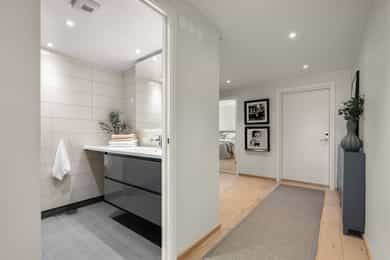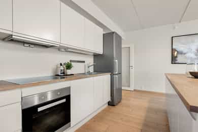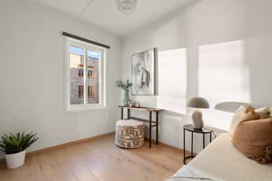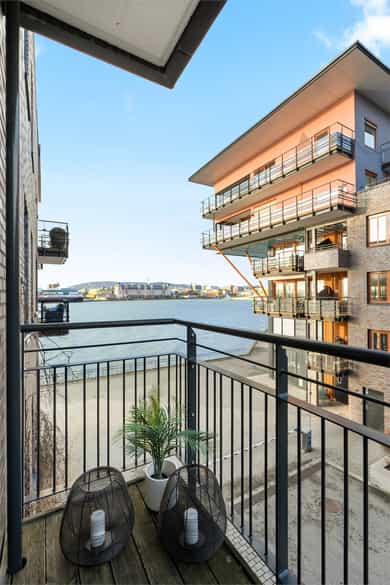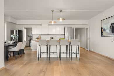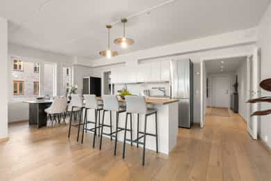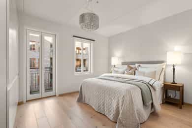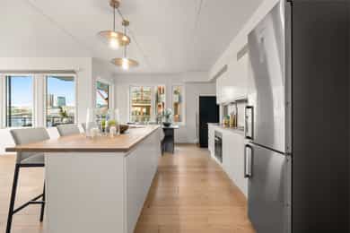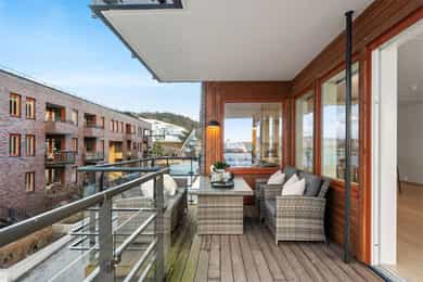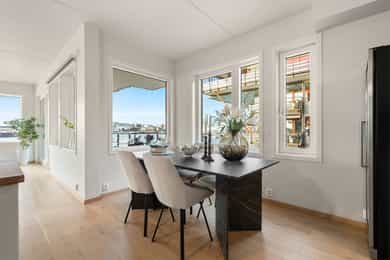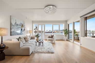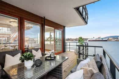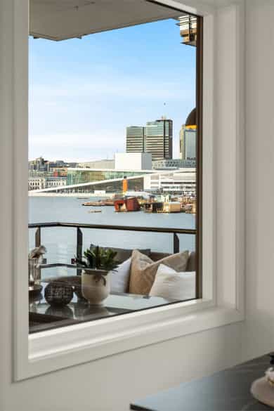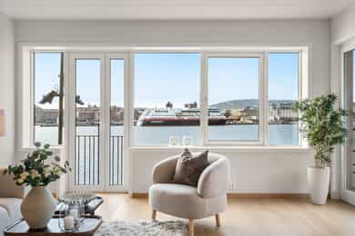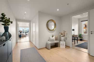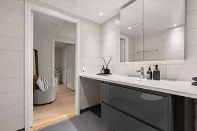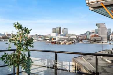 Entré Velkommen inn i en romslig og innbydende entré som gir et svært godt førsteinntrykk av boligen. Her er det god plass til å etablere en praktisk og funksjonell garderobeløsning med skap, skoskap, knaggrekke eller annet ønsket møblement. Den gode plassen gjør det enkelt å holde entréen ryddig og oversiktlig, samtidig som den gir en hyggelig velkomst når du kommer hjem. Stue | Kjøkken Boligen har en åpen og moderne stue- og kjøkkenløsning som skaper et sosialt og luftig oppholdsrom. Planløsningen gjør det enkelt å dele rommet inn i naturlige soner med plass til både sofagruppe og spisebord, samtidig som kjøkkenøyen med barstoler fungerer som et naturlig samlingspunkt. Gulvet er belagt med enstavs hvitkalket eikeparkett, og sammen med lyse overflater gir dette et stilrent og tidløst uttrykk. Store vindusflater fra to himmelretninger sørger for rikelig med naturlig lys og bidrar til en åpen og luftig atmosfære. Utsikten er spektakulær og unik - her kan du nyte panoramautsikt mot fjorden, havnepromenaden og Operahuset. Med beliggenhet helt ytterst på Sørenga får du en helt spesiell følelse av å bo nær sjøen, med brygge og strand som nærmeste nabo. Fra stuen er det utgang til en romslig balkong på ca. 12 kvm. Balkongen har god plass til loungemøbler, spisebord og grill - perfekt for hyggelige sommerkvelder. Her er det også belysning samt doble strømuttak på vegg. Kjøkkenet fremstår lyst, moderne og tidløst, med glatte hvite fronter og belysning under overskapene. Over benkeskapene er det glassplate som gir et stilrent uttrykk og gjør renholdet enkelt. Benkeplatene på både kjøkkenbenk og kjøkkenøy er i massiv eik, som tilfører varme til rommet. Kjøkkenet er godt utstyrt med nedfelt oppvaskkum i rustfritt stål og ventilator med avtrekk til kanal. Koketopp med induksjon, stekeovn og oppvaskmaskin er integrert i innredningen. Det er tilrettelagt for plassering av kjøl/frys. Kjøkkenet byr på svært gode arbeidsflater og rikelig med skapplass. Soverom Fra stuen har man adkomst til boligens soverom l. Lyst og luftig soverom, innredet med seng og skrivepult. Soverom II har en fin størrelse med en bredde på ca. 2,65 meter og gode innredningsmuligheter. Rommet egner seg godt som soverom, gjesterom eller hjemmekontor. Hovedsoverommet er romslig og ligger i en attraktiv suiteløsning med eget bad og egen balkong. Her er det god plass til dobbeltseng, nattbord og garderobeskap, og rommet oppleves lyst og luftig. Balkongen er på ca. 2 kvm - perfekt for en rolig morgenkaffe med frisk sjøluft. Bad Boligen har to baderom - ett i tilknytning til gangen og ett tilknyttet hovedsoverommet. Begge badene er utført i samme stil og er prefabrikkerte våtromskabiner, noe som gir en praktisk og robust løsning. Bad 1: Lyst og flislagt baderom med mørke fliser i dimensjon 30 x 30 cm, kombinert med mosaikkfliser i dusjsonen. Badet er utstyrt med dusjhjørne med to rette fronter i herdet glass, vegghengt toalett med innebygget sisterne og lekkasjesikring etter produsentens rutiner. Lang benkeplate i hvitt fra vegg til vegg med helstøpt servant gir god plass til oppbevaring og daglig bruk. Det er opplegg for vaskemaskin under benkeplaten. Badet har balansert ventilasjon og avtrekksventil i himling. Bad 2: Badet tilknyttet hovedsoverommet er innredet med dusjhjørne med to rette glassfronter i herdet glass. Dusjen har både regnfallsdusj og håndholdt dusj. Videre er badet utstyrt med vegghengt toalett med innebygget sisterne og lekkasjesikring etter produsentens rutiner. Servantinnredningen består av skap i hvit høyglans med to skuffer, benkeplate i kompositt og helstøpt servant. Over servanten er det veggskap med speilfronter som gir praktisk oppbevaring. Badet har balansert ventilasjon og avtrekksventil i himling. Bod Boligen disponerer to kjellerboder på henholdsvis 5,3 kvm og 3,15 kvm som gir gode oppbevaringsmuligheter for sesongutstyr, sportsutstyr og øvrige eiendeler.