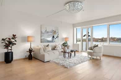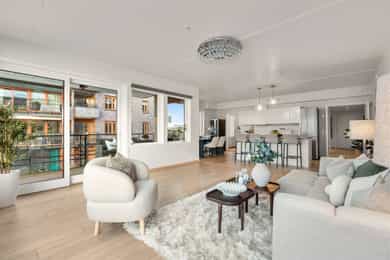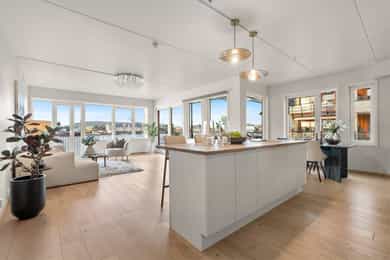 Spektakulær 4-roms frontleilighet på Sørengas vestside med to balkonger, garasjeplass og panoramautsikt