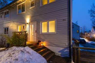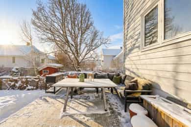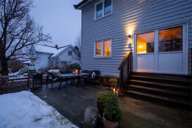 Tiltalende familievennlig halvpart av tomannsbolig med solrike uteplasser. Høy standard. Renovert i 2020. Carport med el