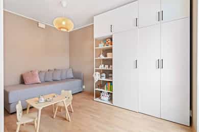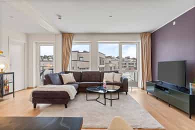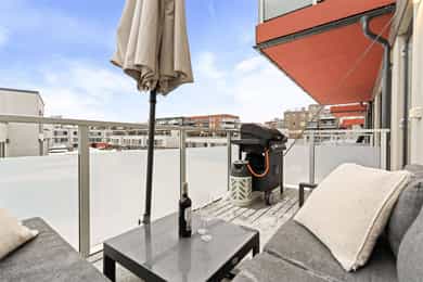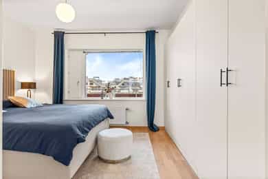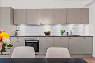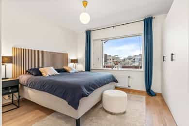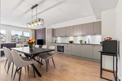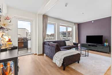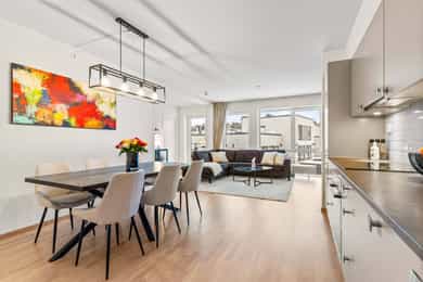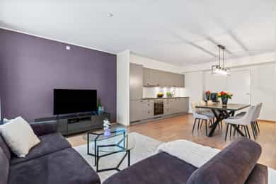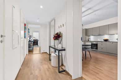 Entré Leiligheten har en lys og romslig entré med god plass til garderobeløsning. Entréen gir et ryddig og innbydende førsteinntrykk, og har adkomst til boligens øvrige rom. Stue / kjøkken Stue og kjøkken er utformet i en åpen og sosial løsning med gode møbleringsmuligheter for både sofagruppe og spisebord. Store vindusflater sørger for rikelig med naturlig lys og bidrar til en luftig romfølelse. Kjøkkenet fremstår moderne med slette fronter, integrerte hvitevarer og godt med skap- og benkeplass. Fra stuen er det utgang til romslig balkong med gode solforhold. Soverom Hovedsoverommet er romslig og har plass til dobbeltseng med tilhørende nattbord. Rommet har gode oppbevaringsmuligheter og et behagelig lysinnslipp fra store vinduer. Soverom 2 egner seg godt som barnerom, gjesterom eller kontor. Rommet har plass til seng og skrivebord, og kan enkelt tilpasses ulike behov. Bad Delikat og flislagt bad fra byggeår, utstyrt med dusjhjørne, servant med innredning og toalett. Badet har moderne uttrykk og gode oppbevaringsløsninger, samt opplegg for vaskemaskin.