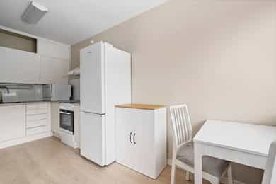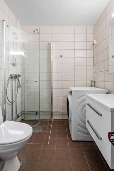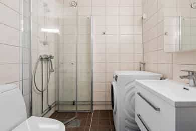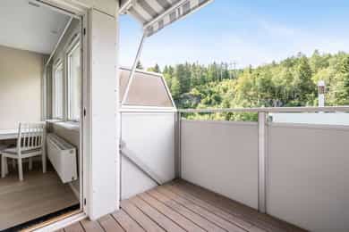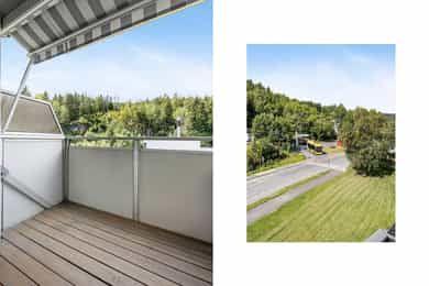 Entré: Lys og romslig entré med god plass til garderobeløsning. Stue: Stue: Fin stue med gode møbleringsmuligheter. Stuen gir god plass for romslig sofagruppe med tilhørende tv-møblement. Videre er det naturlig plass for spisebord i stuen. Adkomst til balkong på ca. 7 kvm fra stuen, med hyggelig utsikt. Bad: Veggene er flislagte, og himlingen består av malte overflater. Gulvet er flislagt. Rommet har elektriske varmekabler. Sluk er av type plast. Sanitærutstyr og innredning: - Innredning med nedfelt servant. - Vegghengt speil. - Toalett. - Dusjvegger/hjørne. - Opplegg for vaskemaskin. Avtrekk via mekanisk ventilasjon Kjøkken: Innredning: - Glatte fronter - Benkeplate av laminat Installasjoner: - Komfyrvakt ikke montert. - Waterguard ikke montert. Kjøkkenet er etablert med kullfilter (omluft). Tekniske installasjoner: Vannrørsystemet består av plast og kobber. Avløpsrør av plast. Leiligheten har mekanisk ventilasjon. Det er mekanisk avtrekk på bad og vindusventiler i øvrige rom. Leiligheten har fjernvarme med radiator. Det elektriske anlegget er utstyrt med automatiske sikringer, og sikringsskapet er plassert i felles teknisk rom. Leiligheten har brannslokkingsutstyr og røykvarslere i henhold til forskriftskrav. Det er i forbindelse med salget utarbeidet en tilstandsrapport fra bygningssakkyndig. Tilstandsrapporten er en teknisk gjennomgang av boligen med oppdagede avvik. Forhold som har fått TG2 og TG3 må gjennomgås spesielt nøye, da disse indikerer avvik fra normal slitasje og/eller høy alder, med mulig behov for utbedring. Bygningsdeler som har fått TGIU er ikke undersøkt av takstmann. Bygningsdeler som har fått TG2: Leiligheten har vinduer med 2-lags glass. Vurdering av avvik: • Det er påvist avvik rundt innsettingsdetaljer. - Det er registrert noe slitte tetningslister. Normal tid for utskifting av trevinduer er 20-30 år. Normal tid for kontroll og justering av vinduer og hengslede er 2-8 år. Konsekvens/tiltak • Det bør gjøres tiltak for å lukke avviket. TG 2 er satt fordi mer enn halvparten av vinduenes forventede levetid er brukt opp. Det er ingen tegn til skader eller avvik ved befaringen, men alderen på vinduene tilsier at det kan bli behov for vedlikehold i løpet av de neste årene. Leiligheten er utstyrt med en branndør av typen EI30 (2024), i tillegg er det en balkongdør fra 1995. Vurdering av avvik: • Det er avvik: Normal tid for kontroll og justering av tredører 2-8 år. Normal tid for utskifting av tredører og aluminiumsdører 20-40 år. Konsekvens/tiltak Leiligheten har en balkong på ca. 4 m² med adkomst fra stue/kjøkken. Balkongen er tekket med terrassebord og rammekonstruksjon av stål. Vurdering av avvik: • Rekkverket er for lavt i forhold til dagens krav til rekkverkshøyder. - Målt rekkverkshøyde på 1.05 meter. Etasjeskiller består av betongdekke. Toleransekravet er på <10 mm lokalt og <15 mm totalt. Vurdering av avvik: • Det er målt høydeforskjell på mellom 15-30 mm gjennom hele rommet. Tilstandsgrad 2 gis med bakgrunn i standardens krav til godkjente måleavvik. • Målt høydeforskjell på mellom 10 - 20 mm innenfor en lengde på 2 meter. Tilstandsgrad 2 gis med bakgrunn i standardens krav til godkjente måleavvik - Innredning med nedfelt servant. - Vegghengt speil. - Toalett. - Dusjvegger/hjørne. - Opplegg for vaskemaskin. 5. ETASJE > BAD Vurdering av avvik: • Det er avvik: - Det er registrert svertesopp på silikonfuger på servanten. Kjøkkenet er etablert med kullfilter (omluft). Viften er funksjonstestet og fungerer tilfredstillende. 5. ETASJE > KJØKKEN Vurdering av avvik: • Det er kun kullfilterventilator på kjøkkenet og heller ikke andre forserte/mekaniske avtrekksløsninger fra kokesonen. TG 2 settes da det er kun omluft med kullfilter. NS3600 krever mekanisk eller bedre for å kunne gi TG 0/1. Dette er en forenklet kontroll begrenset til de spørsmål og undersøkelser som forskrift til avhendingslova (tryggere bolighandel) § 2-18 inneholder. Dette kan ikke sammenlignes med en kontroll utført av offentlig myndighet (Det lokale eltilsyn) eller registrert elektrovirksomhet, og en bygningssakkyndig har verken kompetanse eller lov til å foreta en slik kontroll. Tilstandsgraden er vurdert ut fra den forenklede og begrensede kontrollen som forskriften inneholder. El-anlegget kan ha feil og mangler som en slik forenklet undersøkelse ikke vil avdekke. Vær derfor oppmerksom på denne risikoen, og søk videre veiledning eller få en fullstendig kontroll utført av registrert elektrovirksomhet.