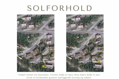 Selger opplyser om følgende solforhold: Sol på terrassen og rundt hytta fra ca vinterferien og fremover. Gode solforhold etter det.