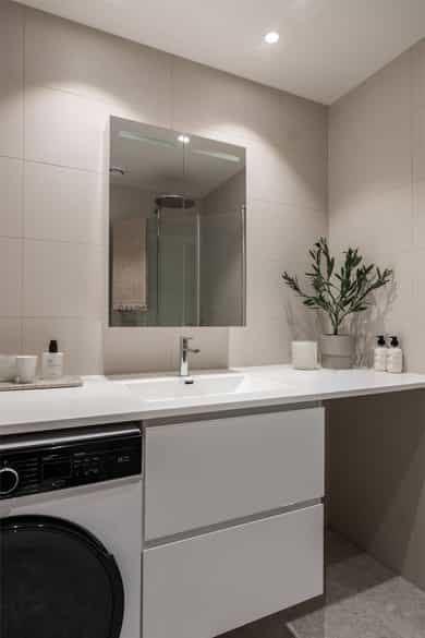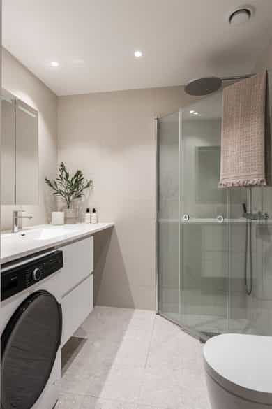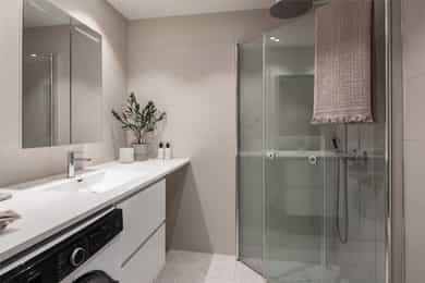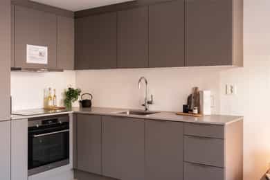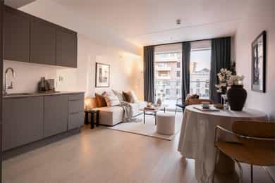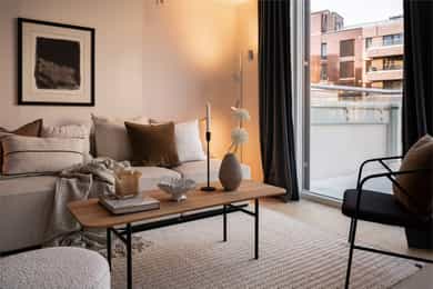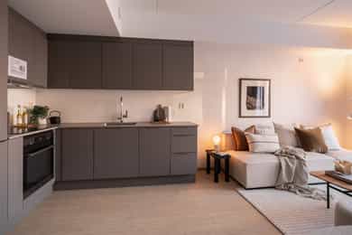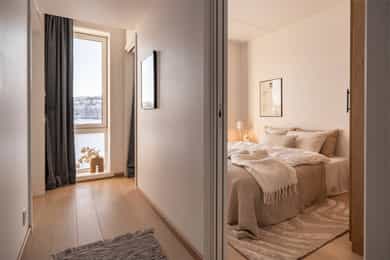 Entré Innbydende gang med plass til å henge fra seg yttertøy og sette fra seg sko på en praktisk og ryddig måte. Kjøkken Stilrent og moderne kjøkken med laminerte skrog og slette fronter som gir et tidløst og elegant uttrykk. Innredningen består av laminat benkeplate med nedfelt oppvaskkum, samt integrerte hvitevarer som platetopp, stekeovn, oppvaskmaskin og kjøl/fryseskap. Kjøkkenet er utstyrt med komfyrvakt, waterguard og ventilator over kokesonen er tilkoblet byggets ventilasjonsanlegg. Stue Lys og innbydende stue med store vindusflater som gir rikelig med naturlig lys og en luftig romfølelse. En hyggelig og sosial sone med plass til sofagruppe, spisebord og TV-møblement. Fra stuen er det direkte utgang til en vestvendt balkong på ca. 6 kvm med rekkverk i stål og glassfelt. Soverom Behagelig soverom med store vindusflater som slipper inn rikelig med naturlig lys og gir et fint utsyn. Soverommet har god plass til dobbeltseng med tilhørende nattbord, samt garderobeskap med gode oppbevaringsmuligheter. Bad Delikat og moderne, flislagt bad med vannbåren varme i gulv. Badet holder en gjennomført standard med stilrene materialvalg og praktiske løsninger. Innredningen består av servantseksjon med skuffer for oppbevaring, speil med integrert belysning, vegghengt toalett og nedsenket dusjsone med inn-/utadslående dører i herdet glass. Det er opplegg for vaskemaskin og avtrekk er tilkoblet byggets ventilasjonsanlegg. Innvendig overflater består av: Gulv- Enstavs parkett og fliser. Vegger - Malte flater og fliser. Himling - Malte flater. Støpt gulv mot grunn og etasjeskillere i betongkonstruksjon.
