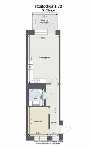 Leiligheten ligger i 5.etasje og inneholder: Stue/kjøkken, entré, bad og soverom. I tillegg disponerer boligen en kjellerbod på 6 kvm.