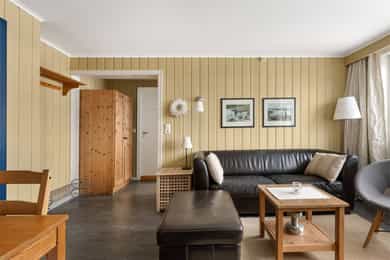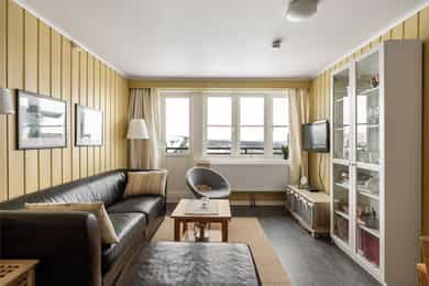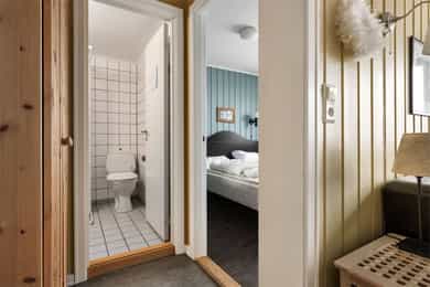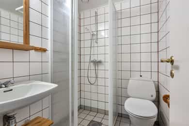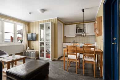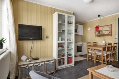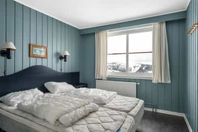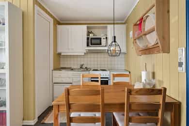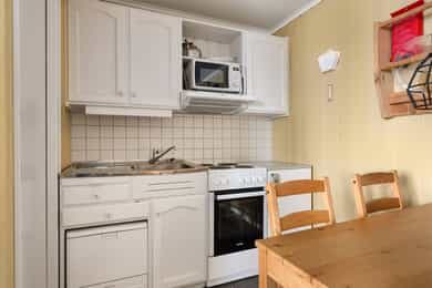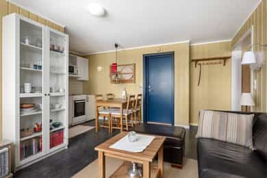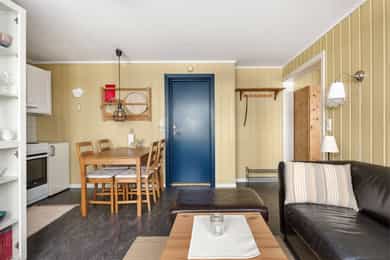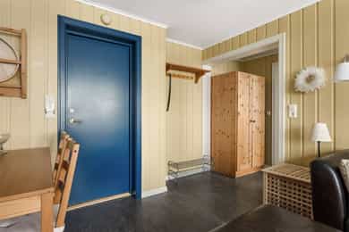 Entré/Inngang Inngangsdør tar deg rett inn til stue/kjøkken men det er laget til god anordning for oppheng av klær rett til venstre når du kommer inn med knaggrekke, skohylle og garderobeskap. Stue Stuen og kjøkkenet er i åpen løsning til hverandre. Stuen er ikke stor av størrelse men riktig møblert og gir plass til treseters sofa, sofabord, ekstra stol/puff. Tv'n er vegghengt som gir plassbesparelse med oppbevaringsmøbel under samt et romslig vitrineskap. Kjøkken Kjøkkeninnredning i heltre med malte profilerte fronter. Benkeplate med beslag og oppvaskkum i metall. Det er plass til frittstående komfyr, oppvaskmaskin og kjøleskap. Plass til kjøkkenbord med tilhørende stoler mellom kjøkken og stue. Bad, wc og vaskerom Helfliset baderom og med slette flater i himlingen. Enkel servant og speil på vegg. Dusjhjørne med skyvedører og gulvmontert toalett. Badet varmes opp med panelovn. Mulighet for klesvask på felles vaskerom i kjeller. Soverom Romslig hovedsoverom med god plass til dobbeltseng, derav to sengeplasser. Et mindre soverom som er praktisk innredet med køyeseng, ypperlig rom for de minste. Totalt får du derfor 4 soveplasser i leiligheten. Lagring Bod i kjeller på ca. 2,5 m2, samt stor felles skibod med privat låsbart skiskap. Tekniske installasjoner Synlige vannrør i kobber/metall. Hovedstoppekran er montert i kjeller. Oppvarming via sentralfyr, oppvarmingen av varmtvann er felles installasjon i bygget. Synlige avløpsrør i plast. Leiligheten har naturlig ventilasjon. El-anlegg med skjult og åpent ledningsnett. Sikringsskap med automatsikringer. Generelle materialvalg Innvendige himlinger med malte glatte flater. Vegger med panel og gulv med belegg. Lette/glatte innerdører og skyvedør til soverom. ___________________________ Det er i forbindelse med salget utarbeidet en tilstandsrapport fra bygningssakkyndig. Tilstandsrapporten er en teknisk gjennomgang av boligen med oppdagede avvik. Forhold som har fått TG2 og TG3 må gjennomgås spesielt nøye, da disse indikerer avvik fra normal slitasje og/eller høy alder, med mulig behov for utbedring. Bygningsdeler som har fått TGIU er ikke undersøkt av takstmann. Bygningsdeler som har fått TG2: - Utvendig > Dører Avvik: Ytterdør: Det er observert skader på dørblad/ dørkarm. - Utvendig > Andre utvendige forhold Avvik: Det er ikke utarbeidet Tilstandsanalyserapport, vedlikeholdsplan e.l. for fellesdeler i bygget. - Tekniske installasjoner > Avløpsrør Avvik: Tilstandsgrad 2 gis med bakgrunn i at mer enn halvparten av forventet funksjonstid for avløpsrør er oppnådd. - Tekniske installasjoner > Ventilasjon Avvik: Ventilasjonen tilfredsstiller ikke dagens krav til komfort. Det er ikke veggventil på soverom. - Kjøkken > 1. Etasje > Stue/kjøkken > Avtrekk Avvik: Kjøkkenventilator har ventilator med omluft (Kullfilter). Det er ingen avtrekksfunksjon koblet ut på kjøkken i område kokesone. Bygningsdeler som har fått TG3: - Tekniske installasjoner > Vannledninger Avvik: Stoppekran er ikke tilgjengelig eller montert i bruksenheten. Mer enn halvparten av forventet funksjonstid for røranlegg er oppnådd. - Våtrom > 1. Etasje > Bad > Generell Avvik: Våtrommet må oppgraderes for å tåle normal bruk etter dagens krav. Vurdering er basert på at anbefalt brukstid for våtrommet er oppnådd. Ikke synlig membran i sluk. Ufagmessig tetting i sluk, det er benyttet tettemasse i slukpotte. Det er ikke spalte i terskel på dusj slik at evt. lekkasjevann vil renne ut av våtrommet i stedet for ned i sluk. Dusjkabinett bærer preg av slitasje. Bygningsdeler som ikke er undersøkt (TGIU): - Utvendig > Balkonger, terrasser og rom under balkonger Avvik: Balkonger/terrasse er snødekt og derfor ikke nærmere vurdert. - Våtrom > 1. Etasje > Bad > Tilliggende konstruksjoner våtrom Avvik: Hulltaking for fuktmåling i tilstøtende konstruksjon er ikke gjennomført da det ikke er fysisk mulig pga. tilliggende konstruksjoner. Dusjhjørne ligger mot annen branncelle. Fuktsøk på overflater er foretatt, se under membran tettesjikt. Når hulltaking for fuktmåling ikke er gjennomført innebærer dette en begrensning i undersøkelsen. Det kan ikke utelukkes at skjulte fuktforhold eller skader i konstruksjonen. Tilstandsgrad ikke undersøkt (TGIU) er derfor valgt for dette kontrollpunktet. Helse, Miljø og Sikkerhet RADON: • Det er ikke foretatt radonmålinger, og bygget hadde ikke krav til radonsperre. Årsgjennomsnittet av radonkonsentrasjon i rom bør ikke overstige 200 Bq/m³ i inneluft. BRANNTEKNISKE FORHOLD: • Det er eier av et hvert objekt som er ansvarlig for at boligen tilfredsstiller krav til branntekniske forhold. - Røykvarsler - Brannslukningsapparat - Felles brannvarslingsanlegg til sentral.