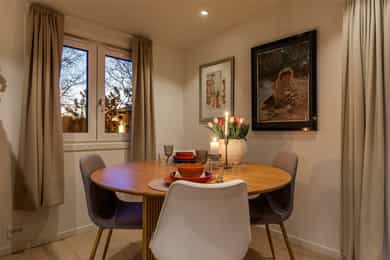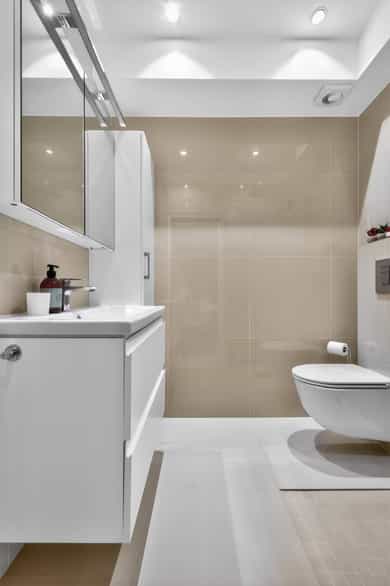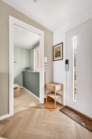 Innvendige overflater: Overflatebehandling gulv: Parkettgulv og fliser. Overflatebehandling vegger: Malte glatte flater. Overflatebehandling himling: Malte glatte flater. Det er stedvis montert downlights. Entré Hyggelig og innbydende entré med praktisk garderobeløsning som gir gode oppbevaringsmuligheter for yttertøy og sko. Et funksjonelt og ryddig første møte med boligen. Kjøkken Moderne kjøkkeninnredning fra 2023 med stilrene overflater og god funksjonalitet. Kjøkkenet har laminert benkeplate med nedfelt oppvaskkum og 1-greps blandebatteri, samt skylleplate mellom over- og underskap. Det er integrerte hvitevarer som oppvaskmaskin, komfyr, platetopp, kombiskap og vinskap. Det er tilkoblet ventilator over koketopp. Stue Koselig og lys stue med store vindusflater som gir rikelig med naturlig lys. Her er det god plass til både sofagruppe, TV-løsning og spisebord. Fra stuen er det direkte utgang til en romslig terrasse på hele 27 kvm – perfekt for sosiale sammenkomster og avslapning utendørs. Bad/vaskerom Lekkert flislagt bad oppgradert i 2023 med gulvvarme som gir god komfort. Badet er utstyrt med moderne innredning bestående av servant med tilhørende skap, speil og belysning, samt dusjsone med dusj direkte på gulv. Opplegg for vaskemaskin er etablert, og rommet har elektrisk styrt ventilasjon. (Det er ikke varmekabler i vaskeromsdelen.) Soverom Koselig og funksjonelt soverom med plass til dobbeltseng. Smarte, tilpassede oppbevaringsløsninger over seng og under vindu utnytter plassen godt og gir et ryddig uttrykk.