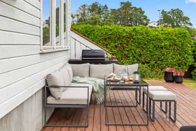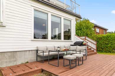 Det er sol i hagen på dagtid samt sol på siden av huset mot soverom om ettermiddagen.