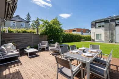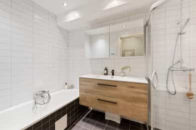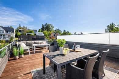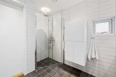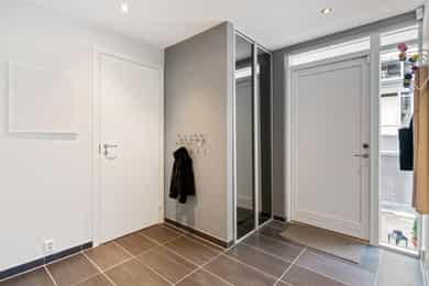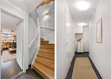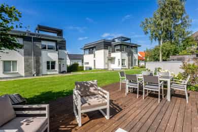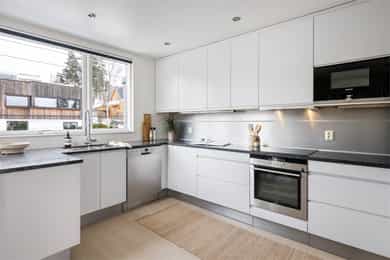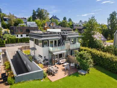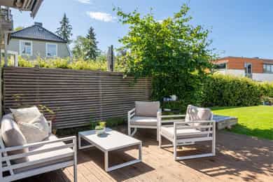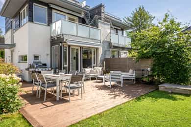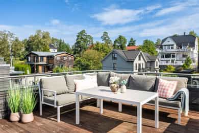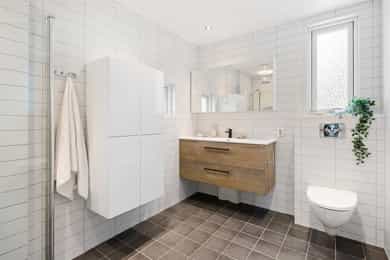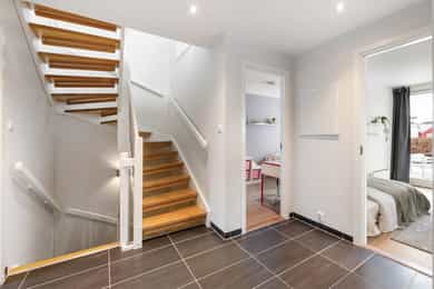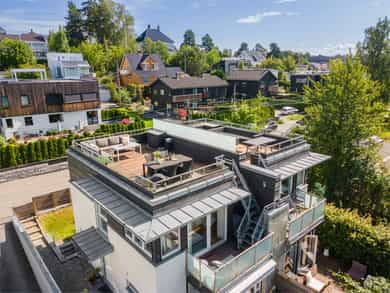 Stue Romslig og stor hovedetasje med stue med gasspeis. Stuen holder en god størrelse og har flere innredningsmuligheter. Store vindusflater og utgang til uteplass gir rommet en luftig og god atmosfære. Stue også i underetasjen med egen inngang som fint kan fungere som et ekstra soverom eller ungdomsavdeling. Terrasser Fantastisk og solrik takterrasse på hele 40 kvm med flott utsyn. Terrassen har god plass til sittegrupper, lounge, solsenger og grill med mer. Videre har boligen flere fine uteplasser med gode solforhold som vender mot vest. Herunder terrasse på 7 kvm med utgang fra stue og en fin markterrasse på hele 40 kvm i hage. Kjøkken Flott HTH kjøkken som ble oppgradert i 2014/15 med nye fronter, nye granittbenkeplater, og ny underlimt ståloppvaskkum. Kjøkkenet er godt utstyrt med integrerte induksjonsplatetopp, stekeovn og mikrobølgeovn. Opplegg for oppvaskmaskin og plass til kjøle/fryseskap. Kjøkkenet har innredning med glatte fronter, har store vindusflater og godt med skap- og benkeplass. Åpen løsning mot spisestue og stue. Soverom I 1. etasje har man en fin soveromsavdeling med tre soverom og et familiebad. Hovedsoverommet holder en god størrelse og har skyvedørsgarderobe. To fine barnerom med plass til seng og garderobeløsning. Utgang til stor og solrik terrasse og hage fra et av barnerommene. Bad Boligen har to flotte bad. Lyst og pent familiebad i 1. etasje og et romslig bad i underetasje. Begge badene har flislagte vegger og gulv, samt malt tak. Rommene har elektriske varmekabler og er innredet med nedfelt servant, veggmontert toalett og dusjhjørne. Både dusj og badekar på badet i underetasje. Vaskerom Romslig og praktisk vaskerom med plass til vaskemaskin og tørketrommel. Veggene har malte plater og malt tak. Vaskerommet har utslagsvask og god arbeidsbenk med overskap. Varmtvannsbereder er plassert i dette rommet. Entré Innbydende og flislagt entré med downlights, varmekabler og integrert garderobeløsning som gir et godt førsteinntrykk av boligen. Overflater Gulv: Flislagt gulv og laminat gulv. Vegger: Glatte, malte flater. Fliser på bad. Himlinger: Glatte, malte himlingsflater. Det er montert downlights i nedsenket himling ved kjøkkenet og entré/gang.