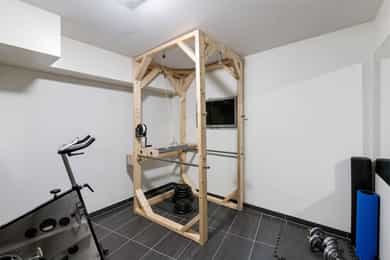 Gang, bad, kjellerstue, vaskerom og boder. Utgang fra en bod til felles garasjeanlegg.