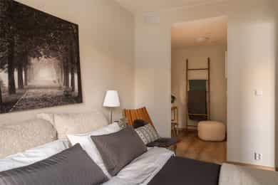 Entré: Vel inne blir man møtt av en innbydende entré med plass til oppheng av yttertøy. Hele leiligheten er malt i nydelige fargetoner, og gulvene er dekket med laminat. Stue: Stuen er et lyst og hyggelig oppholdsrom. Store vindusflater fra gulv til tak sikrer gode lysforhold. Den franske balkongen skaper en forlengelse av rommet og bidrar til en luftig atmosfære. Rommet har en fin planløsning med god plass til spisebord, sofakrok og TV-møbler. Den nydelige fargetonen gjør det enkelt å sette sitt eget preg. Oppvarming skjer via vegghengt radiator. Kjøkken: Kjøkkenet ligger i en åpen og sosial løsning mot stue og spisestue. Det har en funksjonell og gjennomtenkt utforming med rikelig skap- og benkeplass. Lekker innredning fra Sigdal med moderne fronter og laminert benkeplate. Kjøkkenet er velutstyrt med integrerte hvitevarer og består av stekeovn, platetopp, mekanisk avtrekksvifte, oppvaskmaskin og kjøl-/fryseskap. Bad: Romslig bad med morderne fliser og fargevalg. Badet har vannbåren varme i gulvet, downlights i taket og opplegg for oppvaskmaskin. Videre er badet innredet med underskap med skuffer, nedfelt servant, vegghengt toalett og dusjhjørne med glassdører. Soverom 1: Delikat hovedsoverom med to innganger og plassbesparende skyvedører, samt store vindusflater. Rommet har en god planløsning med plass til dobbeltseng og tilhørende møbler. Soverommet er tilknyttet egen bod/garderobe med flere bruksmuligheter og god plass til garderobeskap. Myke fargetoner på veggene skaper et rolig og avslappende miljø. Soverom 2: Lyst soverom med god plass til dobbeltseng og tilhørende møbler. Rommet har flere bruksmuligheter og passer fint som gjesteværelse, barnerom eller kontor. Innvendig overflater: - Tak: Malte plater/etasje skille. - Vegger: Malte plater, fliser på bad. - Gulv: Laminat og fliser på baderom.