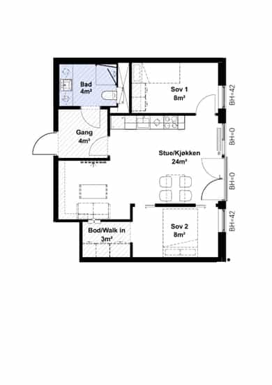 BRA-i: 57 kvm. Entré/gang, stue/kjøkken, bad, innvendig bod og 2 soverom