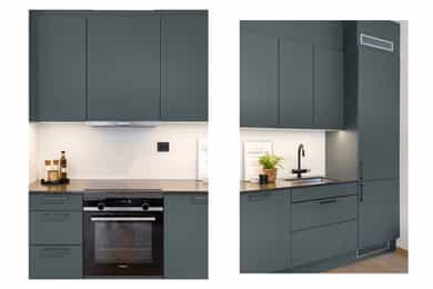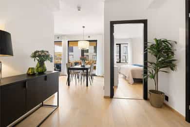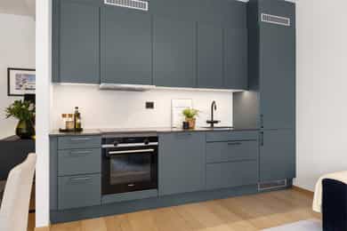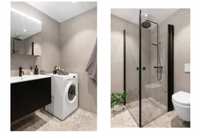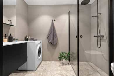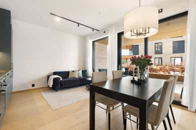 - Entré - Entréen gir et godt førsteinntrykk av boligen med lyse, slette vegger og enstavs eikeparkett på gulvet som er gjennomgående for leiligheten. Her er det plass til oppheng av yttertøy og oppbevaring av sko. Entréen gir videre adkomst til boligens øvrige rom og oppleves som både praktisk og innbydende. - Stue - Stuen er lys og romslig med god takhøyde og store vindusflater som slipper inn rikelig med naturlig lys. Rommet har enstavs eikeparkett på gulvet og slette, malte vegger i lyse fargetoner som gir et moderne og stilrent uttrykk. Her er det god plass til både sofagruppe og spisebord. Fra stuen er det utgang til en romslig vestvendt terrasse på hele 26 m², som gir gode solforhold og fungerer som en naturlig forlengelse av oppholdsrommet i de varmere månedene. - Kjøkken - Kjøkkenet er fra byggeår og har en moderne kjøkkeninnredning med glatte fronter levert av HTH. Benkeplaten er utført i kompositt og er utstyrt med underlimt metallvask fra Blanco samt ettgreps kjøkkenarmatur. Mellom benkeplate og overskap er veggene utført som slette, malte flater. Gulvet har enstavs parkett, veggene er slette og malte, og taket er slett malt med spotteskinne som belysning. Det er også belysning under overskap som gir gode arbeidsforhold. Kjøkkenet er utstyrt med kjøkkenventilator fra Røroshetta tilkoblet byggets sentrale ventilasjonssystem. Kjøkkenet er utstyrt med følgende hvitevarer: – Integrert stekeovn fra Siemens – Induksjonstopp fra Siemens – Oppvaskmaskin fra Siemens – Kombiskap fra Siemens – Avtrekksvifte fra Røroshetta Det er installert vannstoppesystem og komfyrvakt. - Soverom - Soverommet fremstår som lyst og rolig med enstavs eikeparkett på gulvet og slette, malte vegger i lyse toner. Rommet har god plass til dobbeltseng og tilhørende møblement, samt mulighet for garderobeløsning. Store vindusflater sørger for godt med naturlig lys og en luftig romfølelse. - Bad - Badet er moderne og stilrent, oppført i henhold til teknisk forskrift fra 2017 (TEK17). Det foreligger dokumentasjon i form av kontrollerklæringer og ferdigattest. Veggene er flislagt med fliser i format 60 × 60 cm, og på gulvet er det tilsvarende fliser med varmekabler for god komfort. Dusjsonen er nedsenket. Badet er utstyrt med plastsluk, og det er observert membran under klemringen i sluket. Innredningen består av en praktisk skuffeseksjon med nedfelt servant og ettgreps blandebatteri. Over servanten er det speilskap med integrert belysning. Badet har vegghengt toalett samt dusjløsning med innfellbare dusjvegger, regnfallsdusj og håndholdt dusj, med integrerte hyller i dusjsonen. Det er opplegg for vaskemaskin. Rommet har balansert ventilasjon med avtrekk via ventil i tak og tilluft via spalte under dør. - Teknisk rom - Leiligheten har et praktisk teknisk rom som også fungerer som innvendig bod. Her er det gode oppbevaringsmuligheter for blant annet støvsuger, rengjøringsutstyr og annet utstyr. I tillegg medfølger en ekstern bod i felles bodkjeller, som gir ekstra lagringsplass.