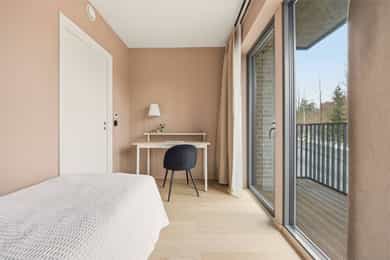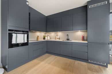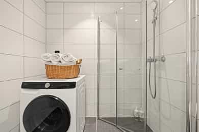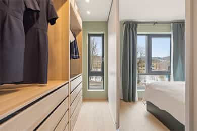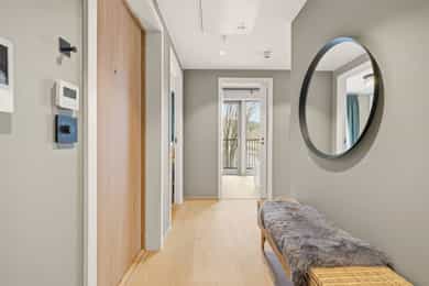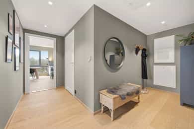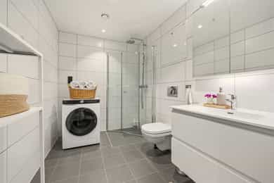 Gang: Lys og innbydende entré med 1-stavs parkett og behagelig vannbåren gulvvarme. Gangen kan enkelt møbleres med skap eller kommode for oppbevaring av yttertøy. Stue: Lys og flott stue med lekre farge- og materialvalg. Det er 1-stavs parkett på gulv, slette malte vegger og store vindusflater som bidrar til godt med naturlig lys. Det er god plass for romslig sofagruppe med tilhørende tv-møblement. Det er adkomst til stor, overbygd balkong fra stue på ca. 20 kvm. Stue og kjøkken er i en åpen løsning som bidrar til et sosialt og hyggelig oppholdsrom. Kjøkken: Pent og innholdsrikt kjøkken fra Sigdal med glatte fronter og benkeplate i laminat. Kjøkkenet er utstyrt med integrerte hvitevarer som stekeovn, platetopp, kjøl/fryseskap og oppvaskmaskin. Det er godt med arbeidsplass på benkeplate, samt gode oppbevaringsmuligheter i skuffer og skap. Det er god plass til spisegruppe i tilknytning til kjøkkenet. Soverom: Leiligheten har 2 gode soverom. Hovedsoverommet gir god plass for dobbeltseng med tilhørende nattbord. Videre er det stor garderobe bak skyvedører. Her er det god plass til garderobeskap hvor du enkelt kan organisere garderoben. Soverom 2 passer perfekt som gjesterom eller kontor. Fra soverommet er det adkomst til en fin balkong på ca. 4 kvm. Bad: Romslig bad med flislagte overflater og varmekabler i gulv. Badet er utstyrt med heldekkende servant med underskap, speilskap med lys, dusjnisje med regndusj, samt toalett. Det er opplegg for vaskemaskin og tørketrommel på badet. Videre er det innfelte downlights i tak for tilpasset belysning.
